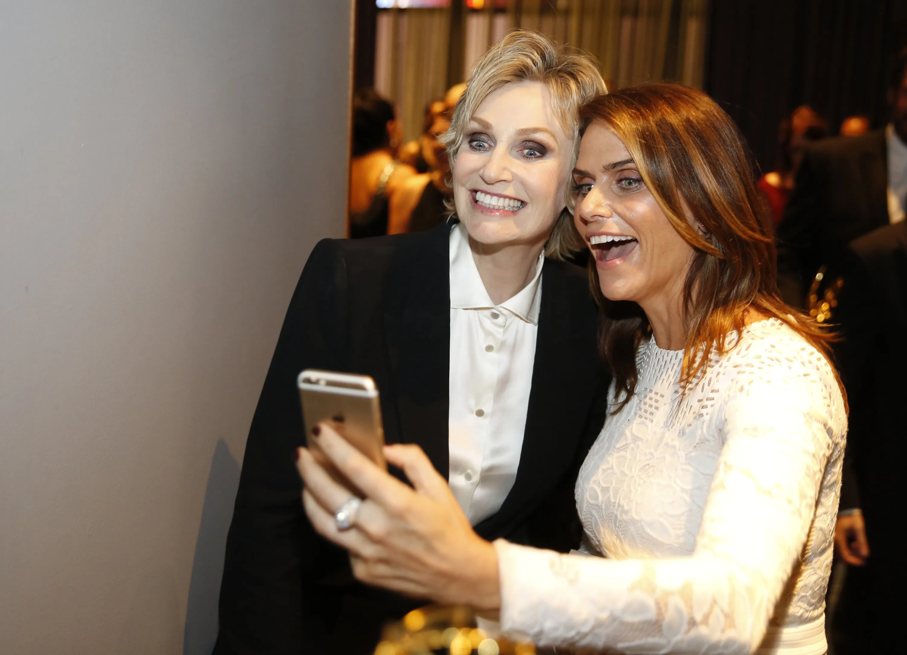 Jane Lynch, left, and Amy Landecker pose backstage at the Television Academy's Creative Arts Emmy Awards at Microsoft Theater on Saturday, September 12, 2015, in Los Angeles. (Photo by Colin Young-Wolff/Invision for the Television Academy/AP Images)