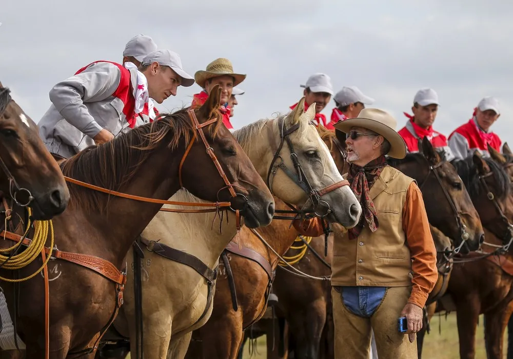 Steven Bond (R) from Texas, U.S. talks to participants before the start of the Russian Rodeo in the village of Kotliakovo, Bryansk region, southeast of Moscow, Russia, September 12, 2015. (Photo by Maxim Shemetov/Reuters)