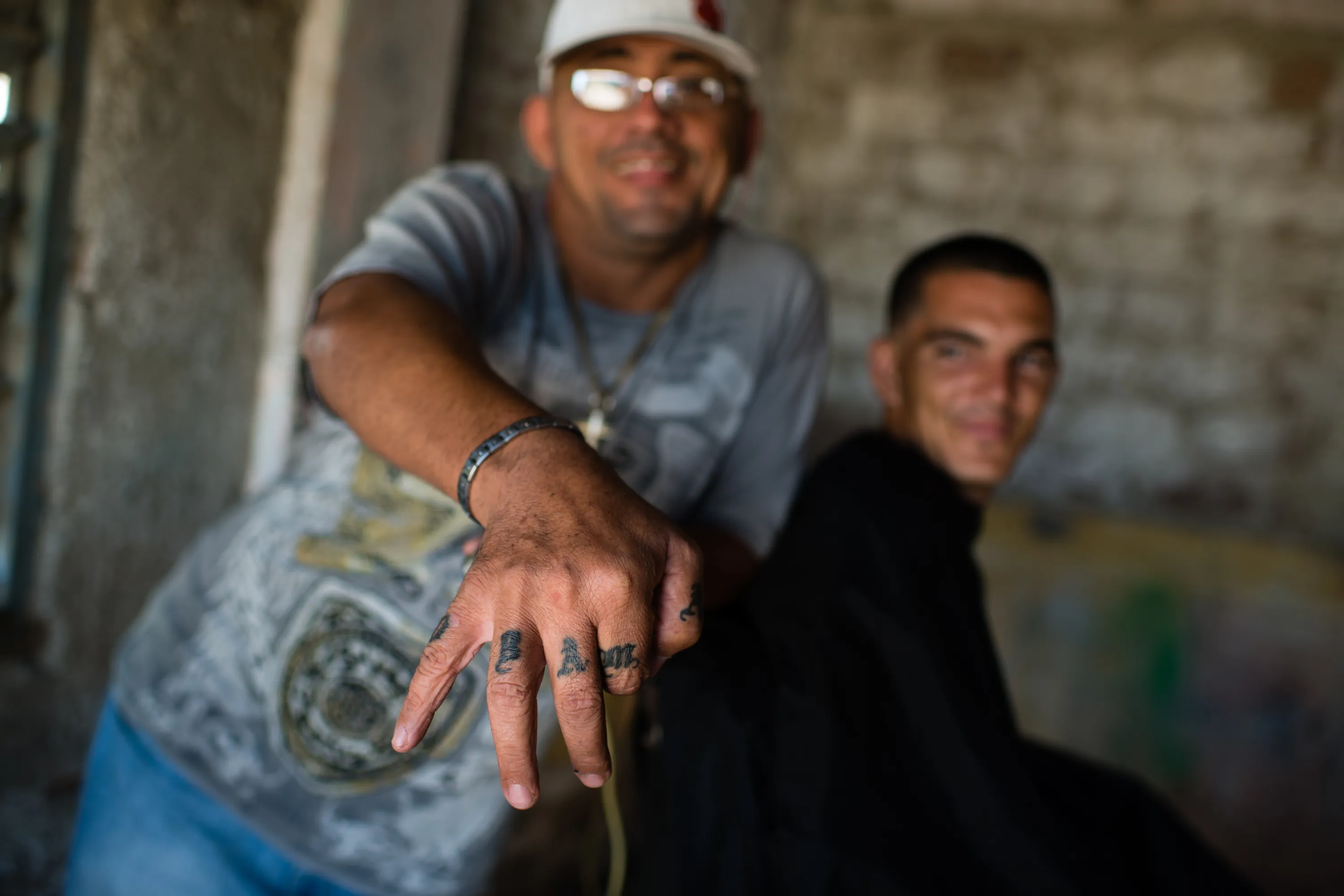 Barber, Debray Alonzo, 47, shows the tattoo of OBAMA on each finger of his right hand. He says he likes the United States and President Obama, so he wanted to have his name tattooed. On the right is Joel Vallero, 26, who is getting a haircut in the small shack in the poor neighborhood of Juruquey, in Camaguey. (Photo by Sarah L. Voisin/The Washington Post)