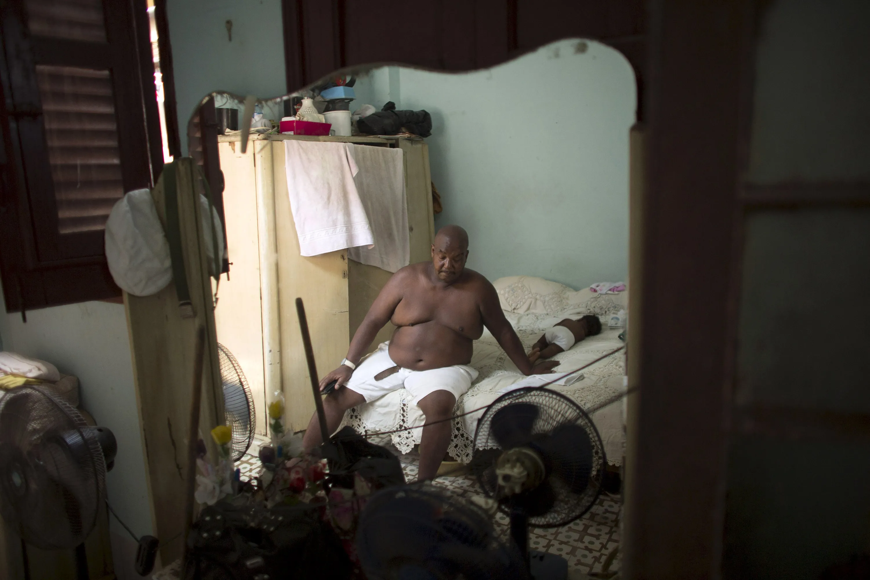 Public park caretaker Idalberto Diaz, 55, rests in a bed beside his 6-month-old granddaughter Lia, before a ceremony in a house known as Cabildo, or religious house by Santeria tradition, in downtown Havana, August 7, 2015. (Photo by Alexandre Meneghini/Reuters)