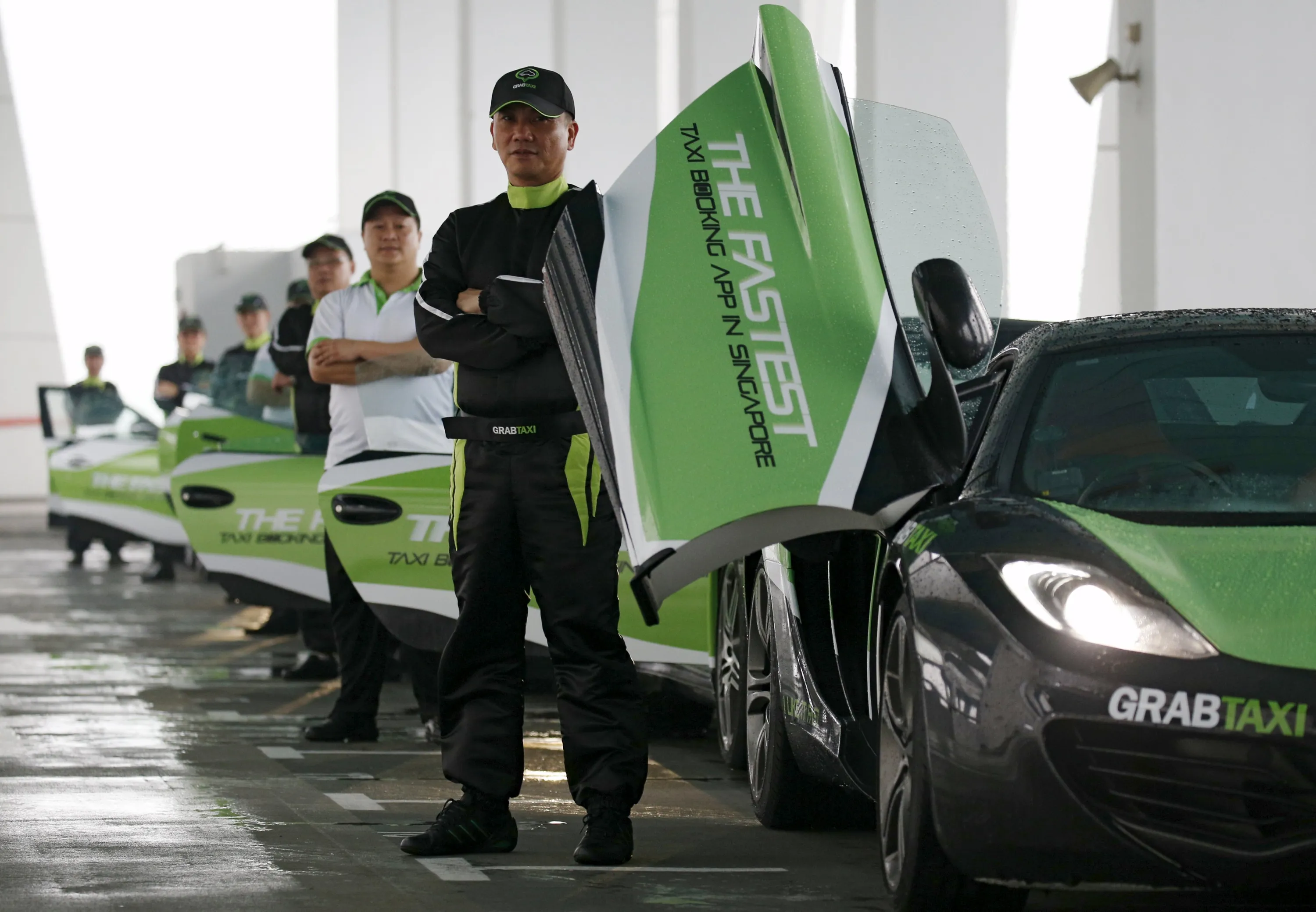 Drivers of taxi-booking app GrabTaxi's fleet of seven luxury cars pose for a photoshoot before they start picking passengers in Singapore September 15, 2015. The fleet of seven luxury cars, consisting of Porsche, Maserati, Aston Martin and McLaren cars, will be chauffeuring passengers for free within the city from Tuesday to Sunday during the Singapore F1 Grand Prix season. (Photo by Edgar Su/Reuters)