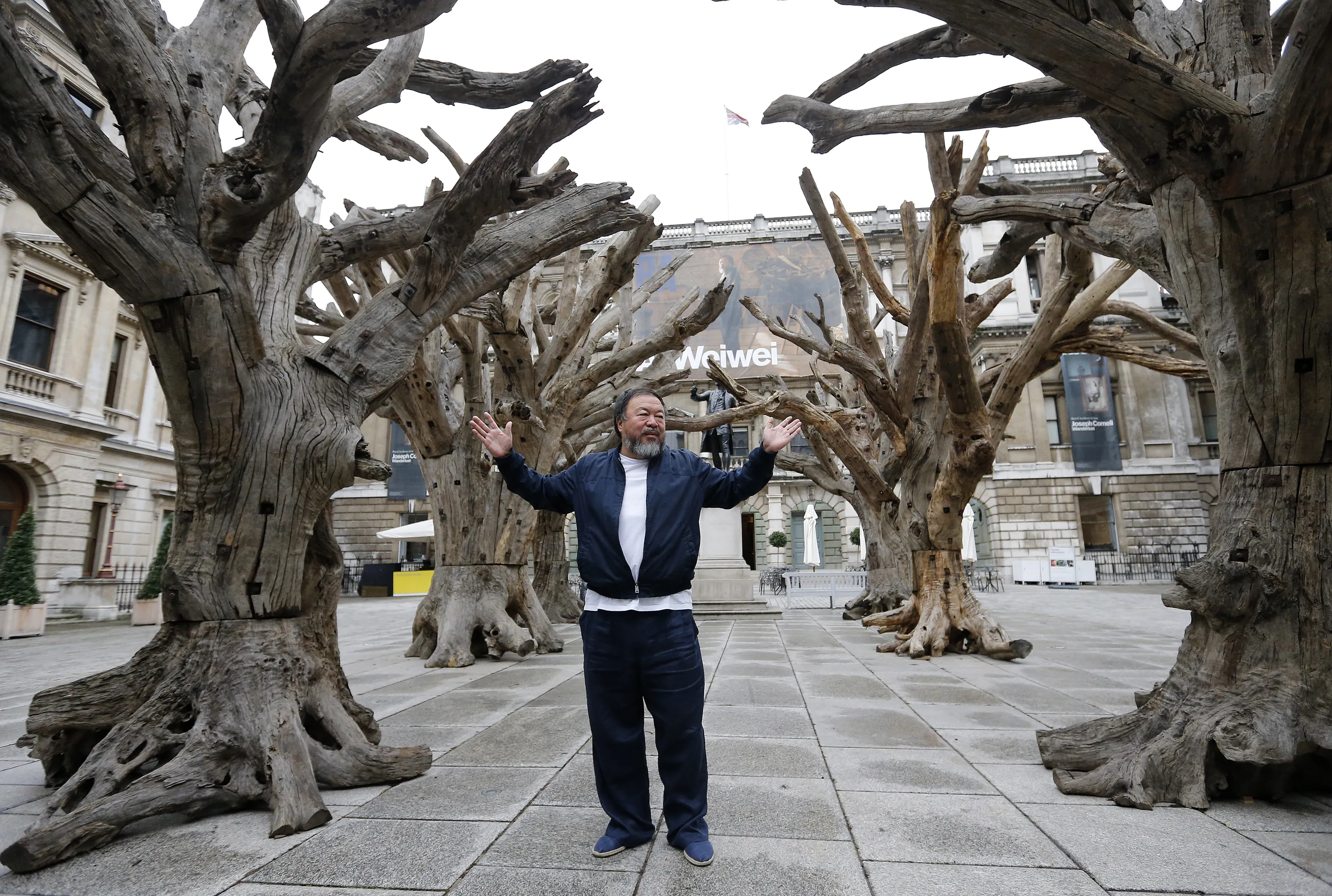 Chinese artist Ai Weiwei poses for photographers with one of his pieces at his exhibition at the Royal Academy of Arts in London, Tuesday, September 15, 2015. The exhibition opens to the public on September 19th. (Photo by Frank Augstein/AP Photo)