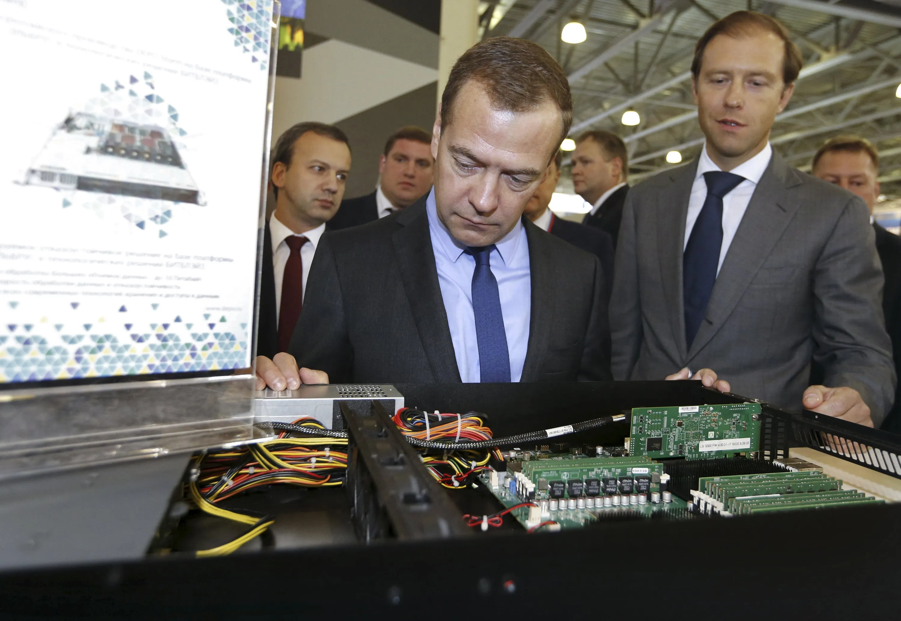 Russian Prime Minister Dmitry Medvedev (L) visits the international specialized exhibition “Import substitution”, with Minister of Industry and Trade Denis Manturov (R) seen nearby, outside Moscow, Russia, September 15, 2015. The exposition displays goods and services, including achievements of Russian producers, which are expected to replace imports from the European Union and United States, which were earlier banned by Russia, in retaliation for their sanctions over Moscow's role in the conflict in Ukraine, according to local media. (Photo by Dmitry Astakhov/Reuters/RIA Novosti)