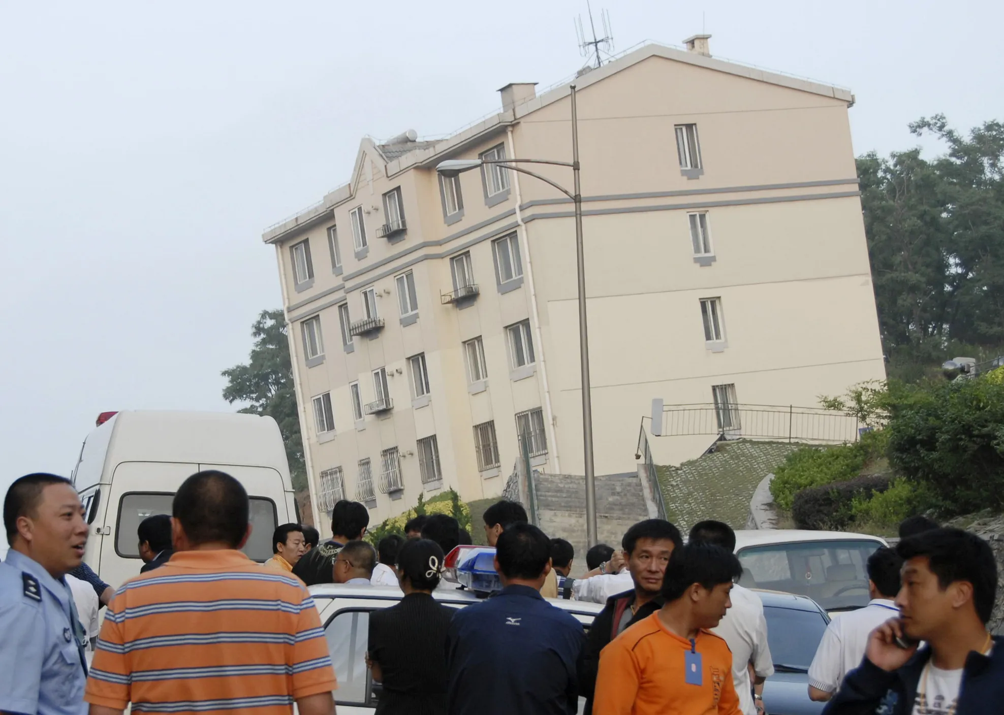 An apartment building teeters on its foundation after a landslide in Dalian, northeast China's Liaoning province, June 28, 2007. (Photo by Reuters/China Daily)