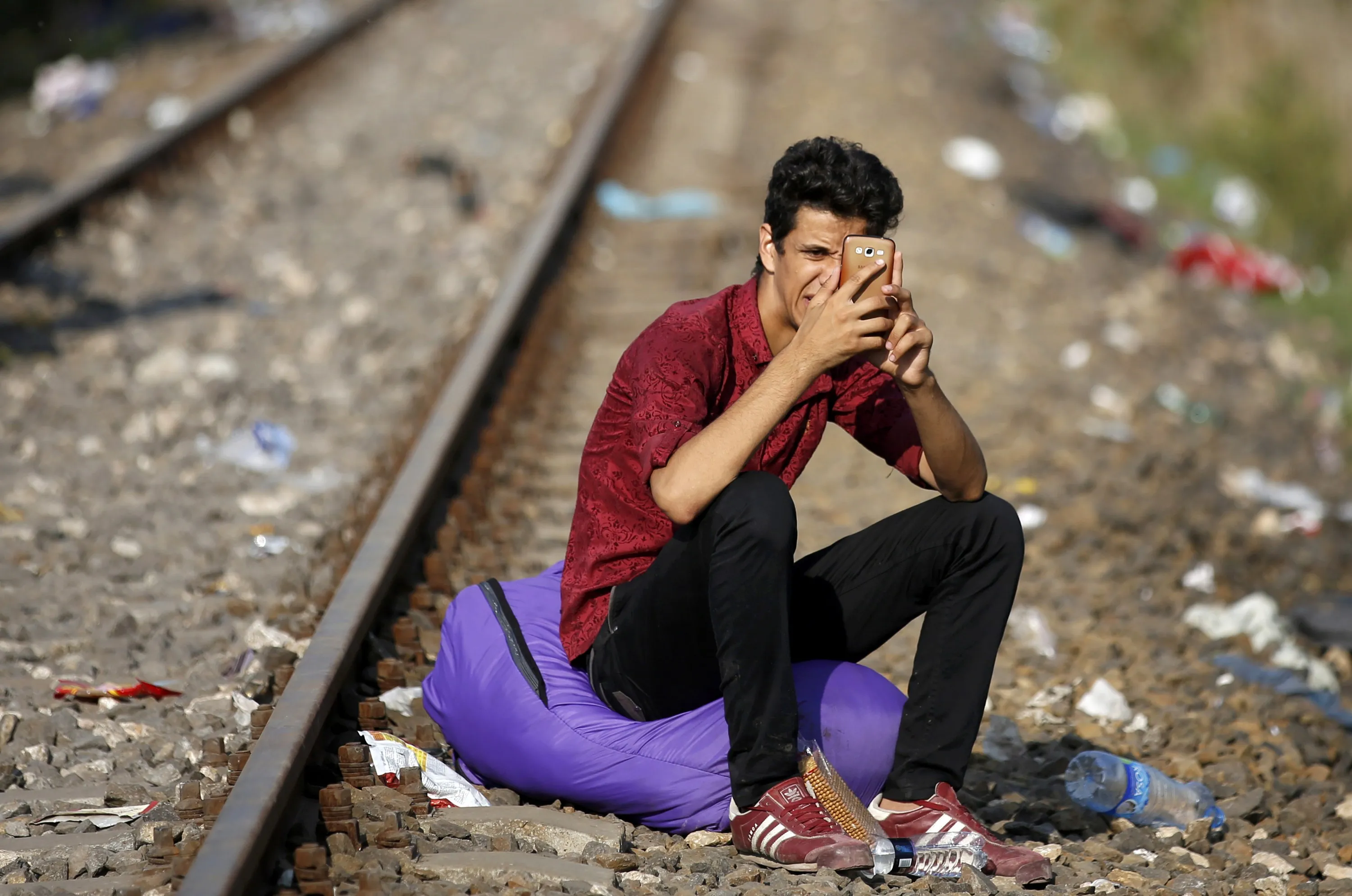 A migrant uses his mobile device as he rests on railways after crossing into the country from Serbia at the border near Roszke, Hungary September 13, 2015. (Photo by Dado Ruvic/Reuters)