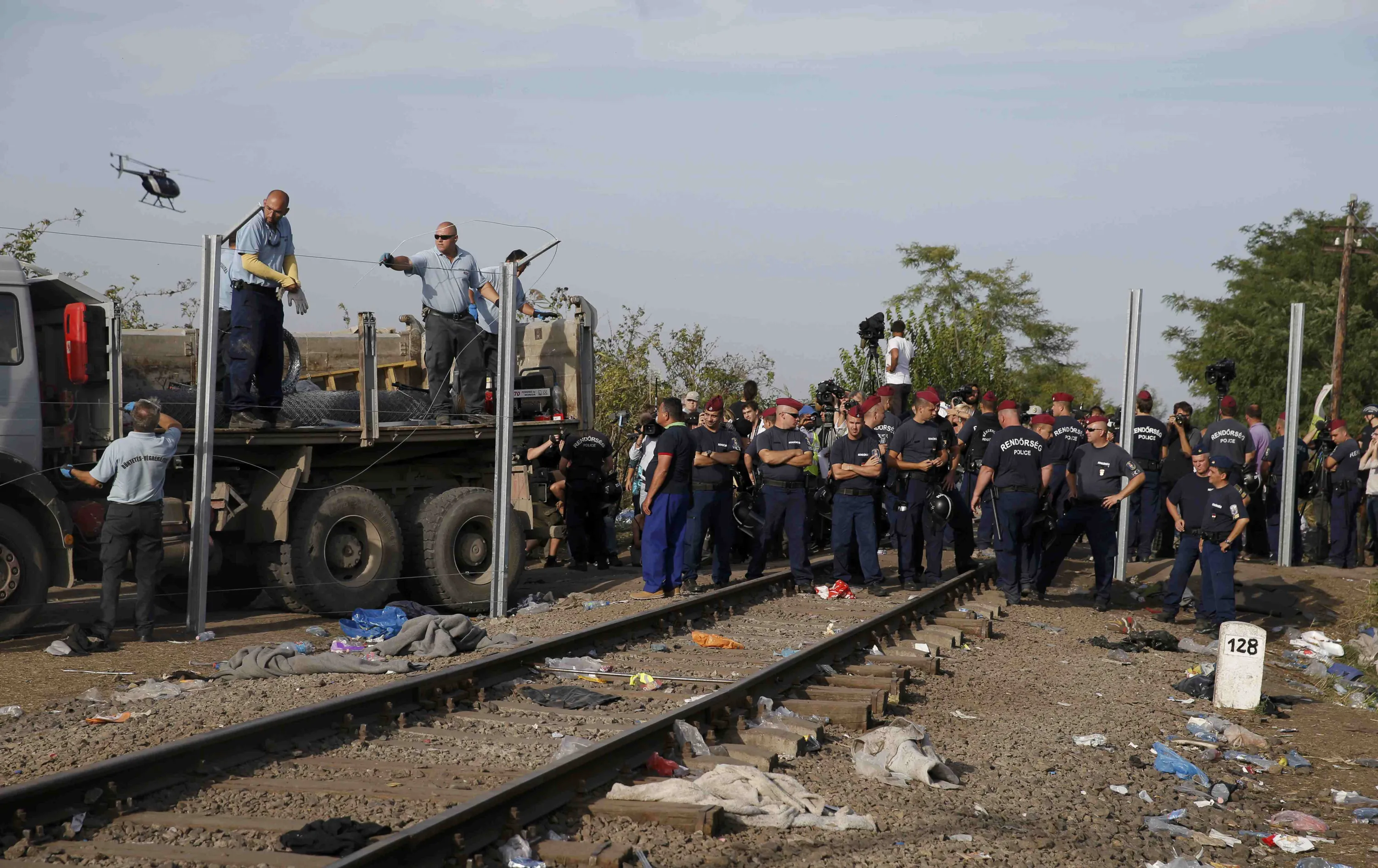Hungarian police officers stand along the fence at the Serbian border while sealing it near the village of Horgos, Serbia, September 14, 2015, near the Hungarian migrant collection point in Roszke. (Photo by Marko Djurica/Reuters)