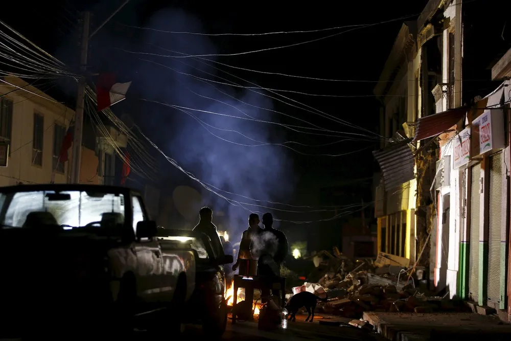 Residents gather next to a damaged building after an earthquake hit areas of central Chile, in Illapel town, north of Santiago, Chile, September 17, 2015. (Photo by Ivan Alvarado/Reuters)