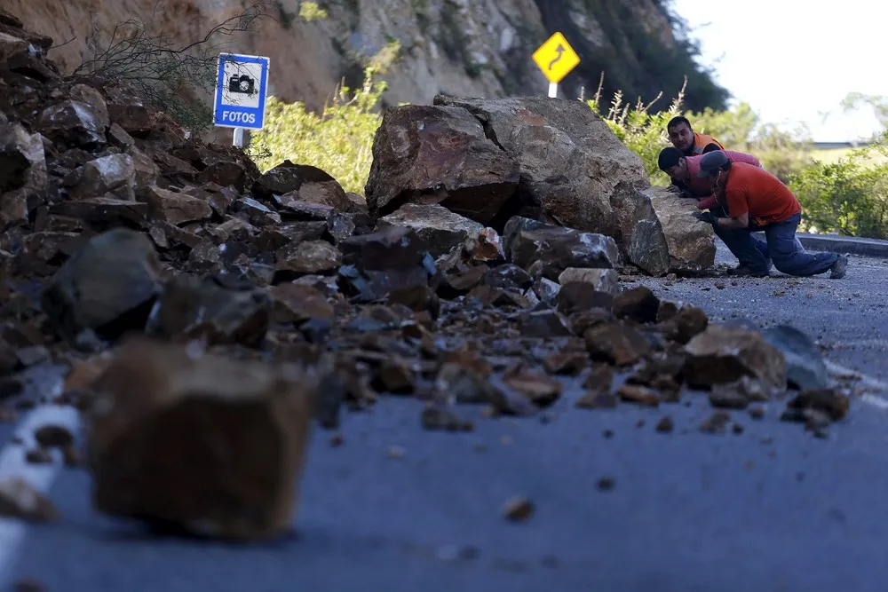 Workers try to remove a rock on the road to Illapel town after an earthquake hit areas of central Chile, September 17, 2015. (Photo by Ivan Alvarado/Reuters)