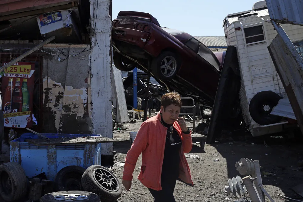 A woman walks past a car, propped up in mid-air, among the debris left behind by an earthquake-triggered tsunami in the coastal town of Coquimbo, Chile, Thursday, September 17, 2015. Several coastal towns were flooded from small tsunami waves set off by late Wednesday's quake, which shook the Earth so strongly that rumbles were felt across South America. (Photo by Luis Hidalgo/AP Photo)