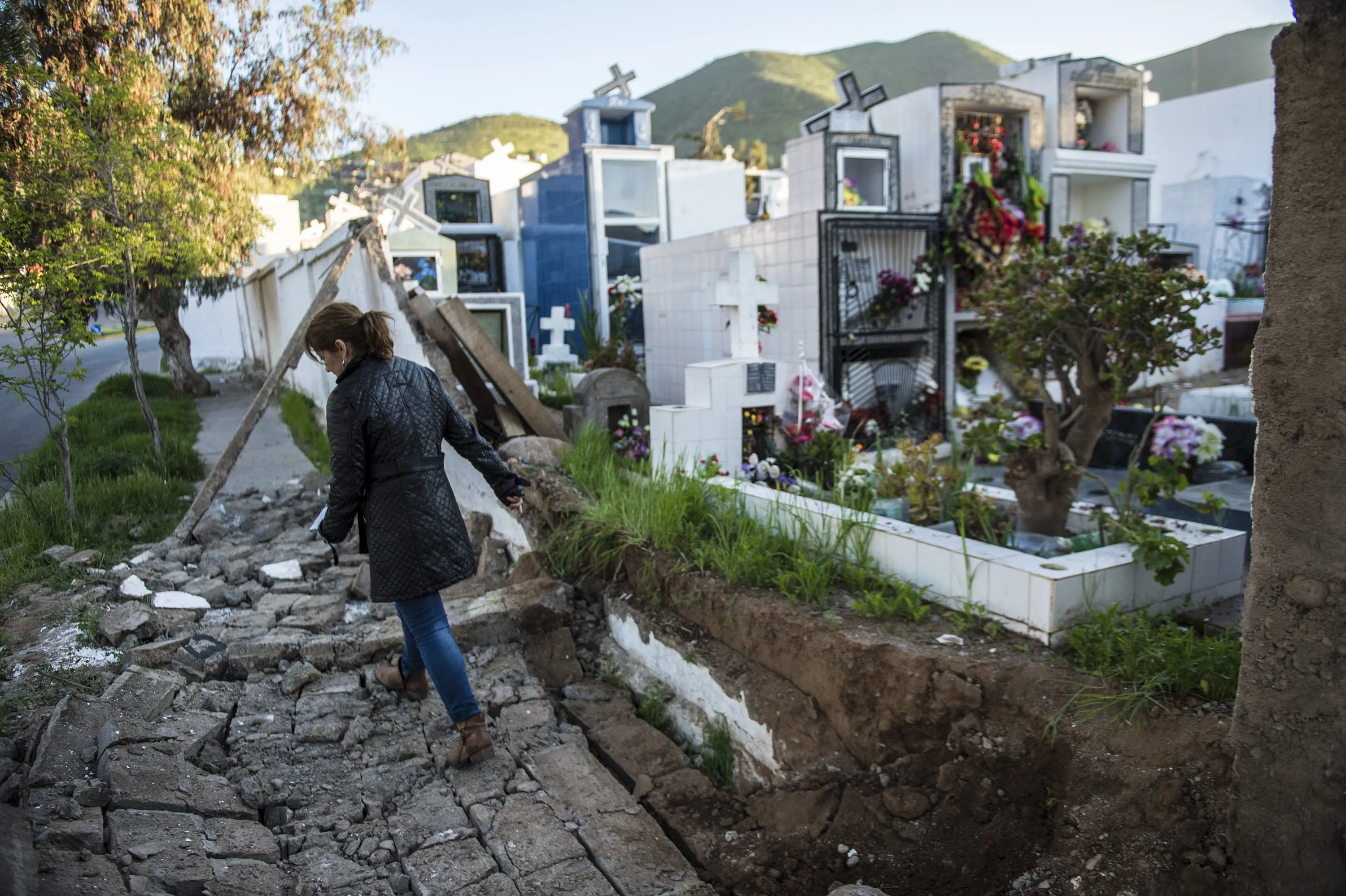 A woman walks over rubble next to a cemetery after an earthquake in Illapel, some 200 km north of Santiago on September 17, 2015. A powerful 8.3-magnitude earthquake struck off Chile on September 17, killing eight people, forcing the evacuation of a million and sparking warnings that tsunami waves could reach Japan. (Photo by Martin Bernetti/AFP Photo)