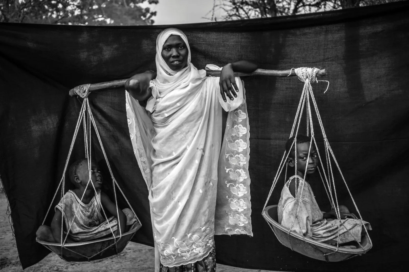 Dowla Barik, 22, poses for a portrait in Doro refugee camp, Maban County, South Sudan on August 5th, 2012. Several months before, Dowla and her six children fled from their village of Gabanit in Sudan's Blue Nile State after numerous bombing raids forced them from their home. The most important object that Dowla was able to bring with her is the wooden pole balanced over her shoulder, with which she carried her six children during the 10-day journey from Gabanit to South Sudan. At times, the children were too tired to walk, forcing her to carry two on either side. (Photo by Brian Sokol/Panos Pictures)