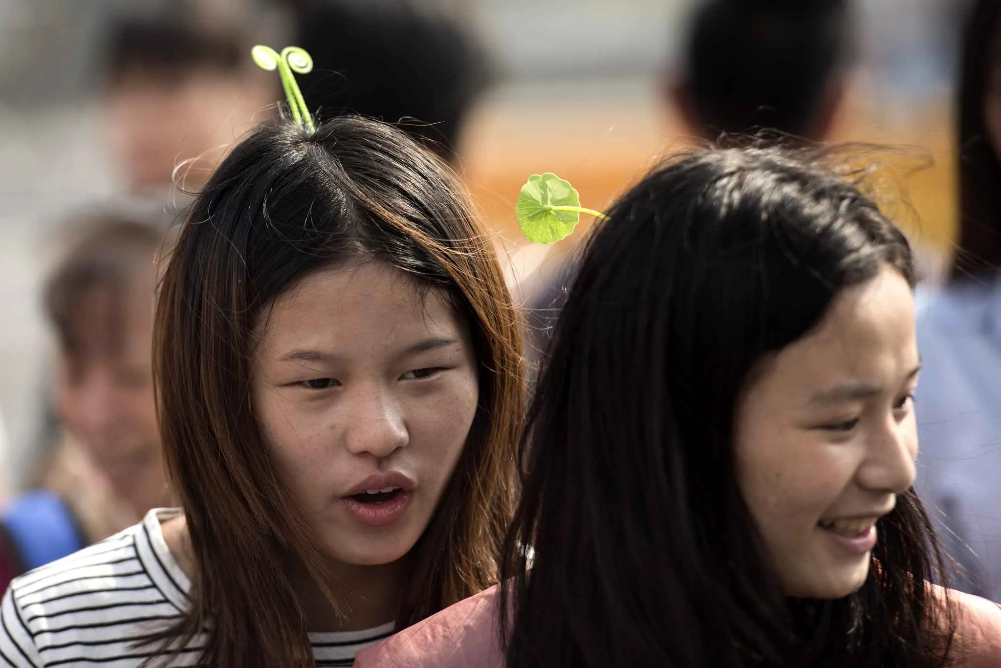 Girls wear floral hairpins near Houhai lake in Beijing on September 14, 2015. Originally from Chengdu, Sichuan province, people wear quirky floral hairpin in touristic areas. (Photo by Fred Dufour/AFP Photo)