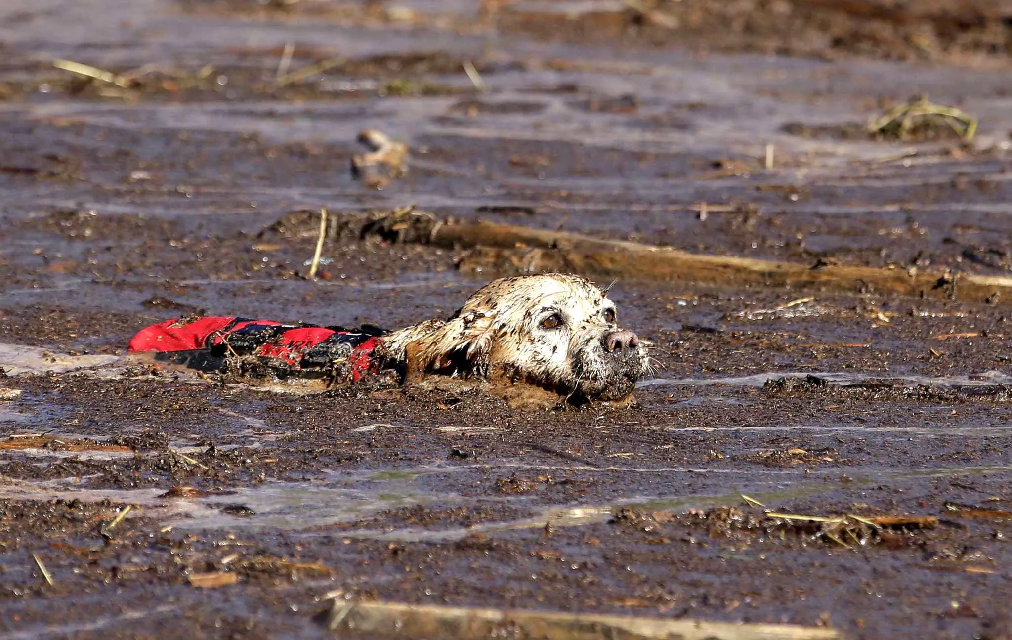 A cadaver dog swims through mud and debris during a search for the remaining victim of a flash flood Thursday, September 17, 2015, in Hildale, Utah. The flood water swept away multiple vehicles in the Utah-Arizona border town, killing several people. (Photo by Rick Bowmer/AP Photo)