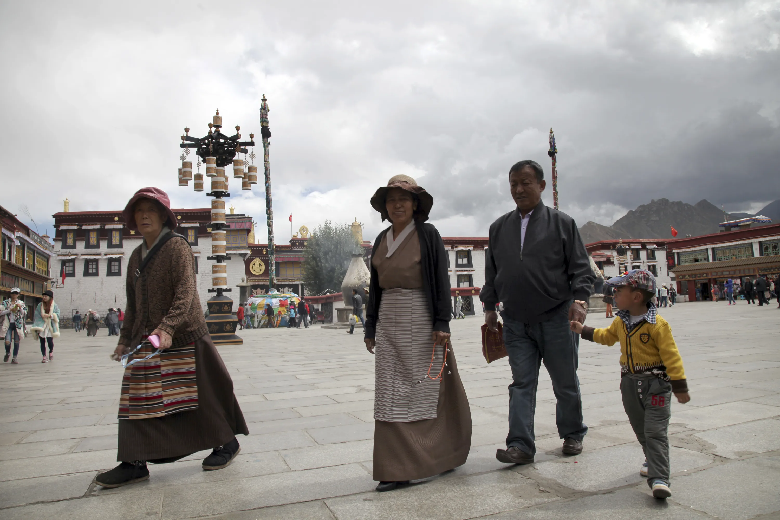 In this Friday, September 18, 2015 photo, a Tibetan family walks across Jokhang Square in the center of Lhasa, capital of the Tibet Autonomous Region in China. Chinese officials have taken foreign journalists on a visit to the region, normally off-limits to them, weeks after Communist Party officials commemorated the 50th anniversary of the establishment of the Tibet Autonomous Region. (Photo by Aritz Parra/AP Photo)