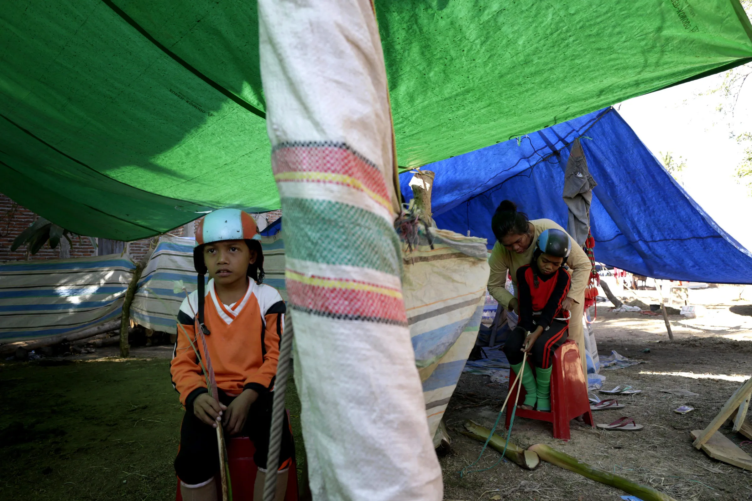 An Indonesian child jockey Sahrul (R), 10, is prepared by his mother as Ardi (L), 9, sits next to them inside a makeshift tent shortly before a traditional horse race marking Indonesia's 70th independence anniversary, in Bima, West Nusa Tenggara province, Indonesia, 08 August 2015. (Photo by Mast Irham/EPA)