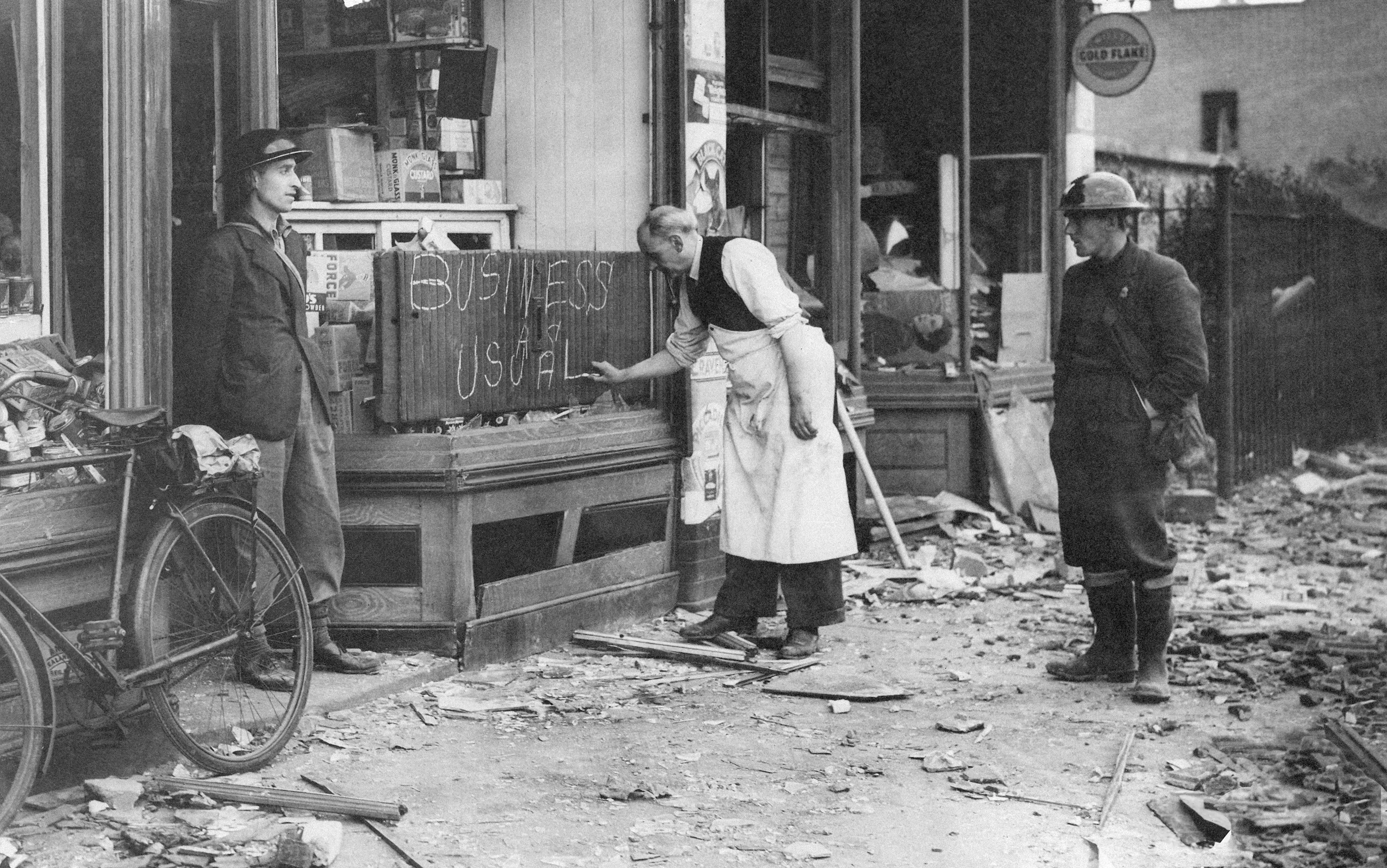 A London shopkeeper in the East End dock area puts up a business as usual sign, September 18, 1940 after his shop had been damaged by bombing. (Photo by AP Photo)