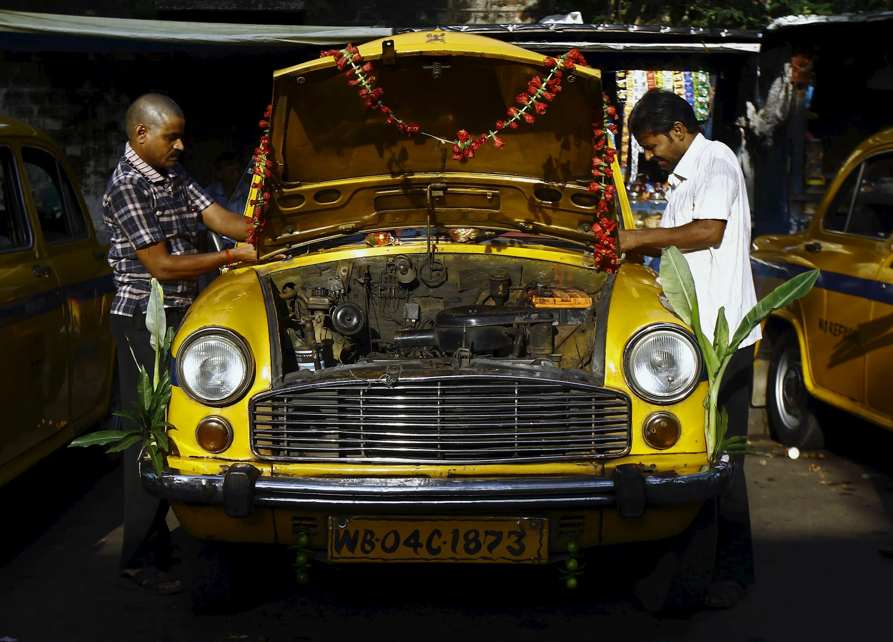 Drivers decorate a yellow ambassador taxi to celebrate the festival of Vishwakarma Puja or the festival of the Hindu deity of architecture and machinery, outside a temple in Kolkata, India, September 18, 2015. (Photo by Rupak De Chowdhuri/Reuters)