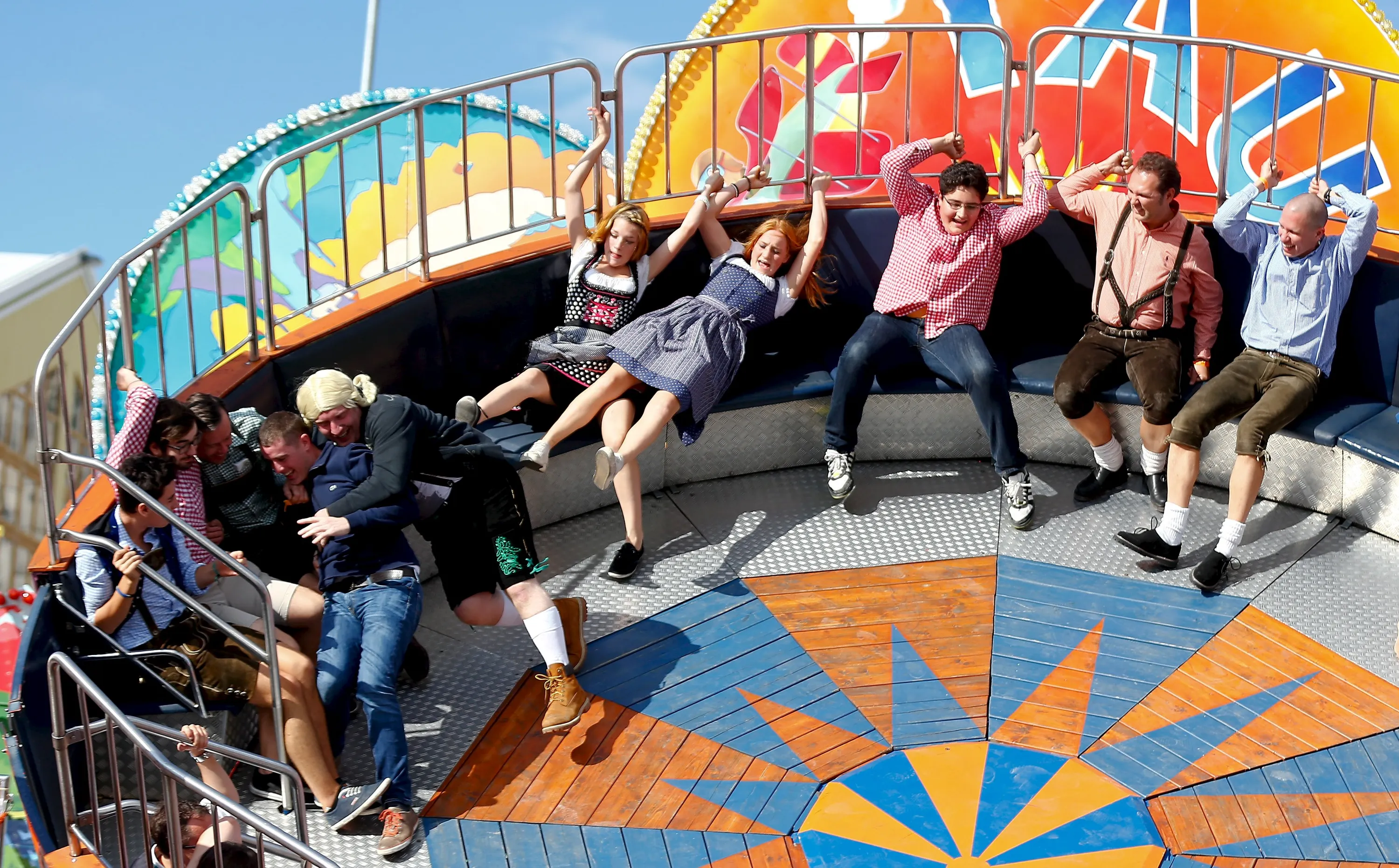 Visitors are seen on a fairground ride during the opening day of the 182nd Oktoberfest in Munich, Germany, September 19, 2015. (Photo by Michael Dalder/Reuters)