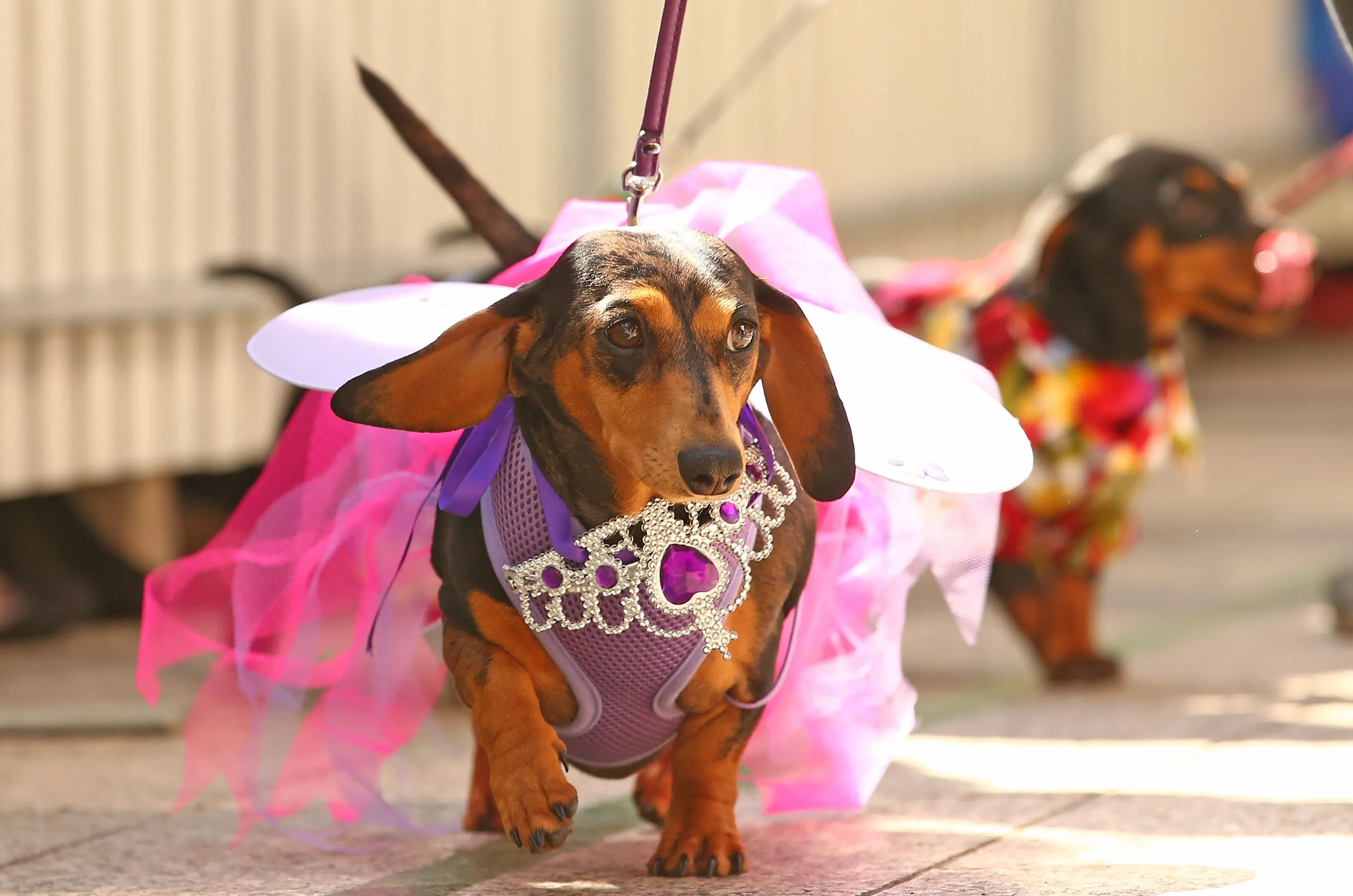 Mini dachshunds compete in the Hophaus Southgate Inaugural Best Dressed Dachshund competition on September 19, 2015 in Melbourne, Australia. (Photo by Scott Barbour/Getty Images)