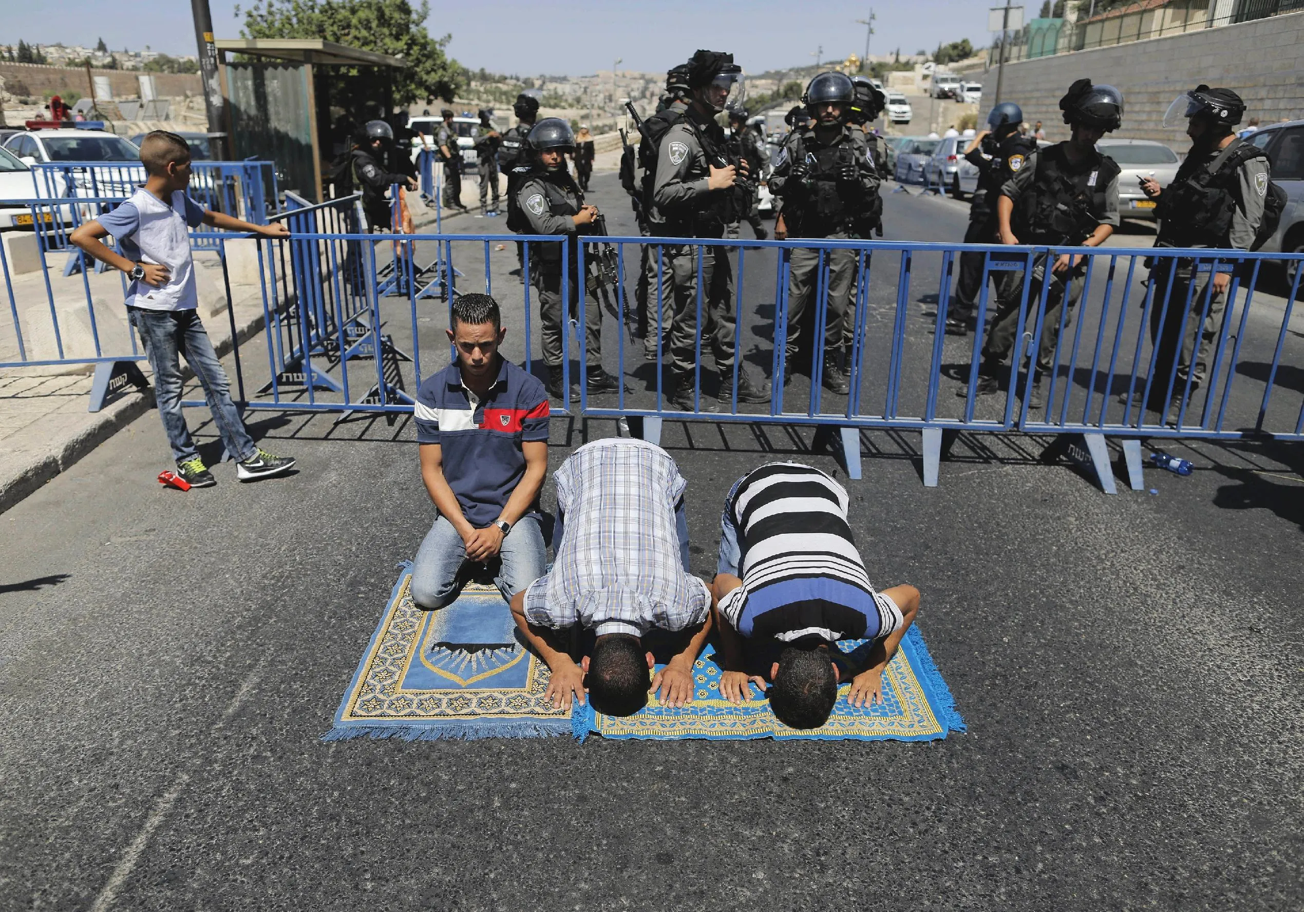 Palestinian men take part in Friday prayers outside the Old City as Israeli border police officers patrol nearby in Arab east Jerusalem neighbourhood of Ras al-Amud September 18, 2015. (Photo by Ammar Awad/Reuters)