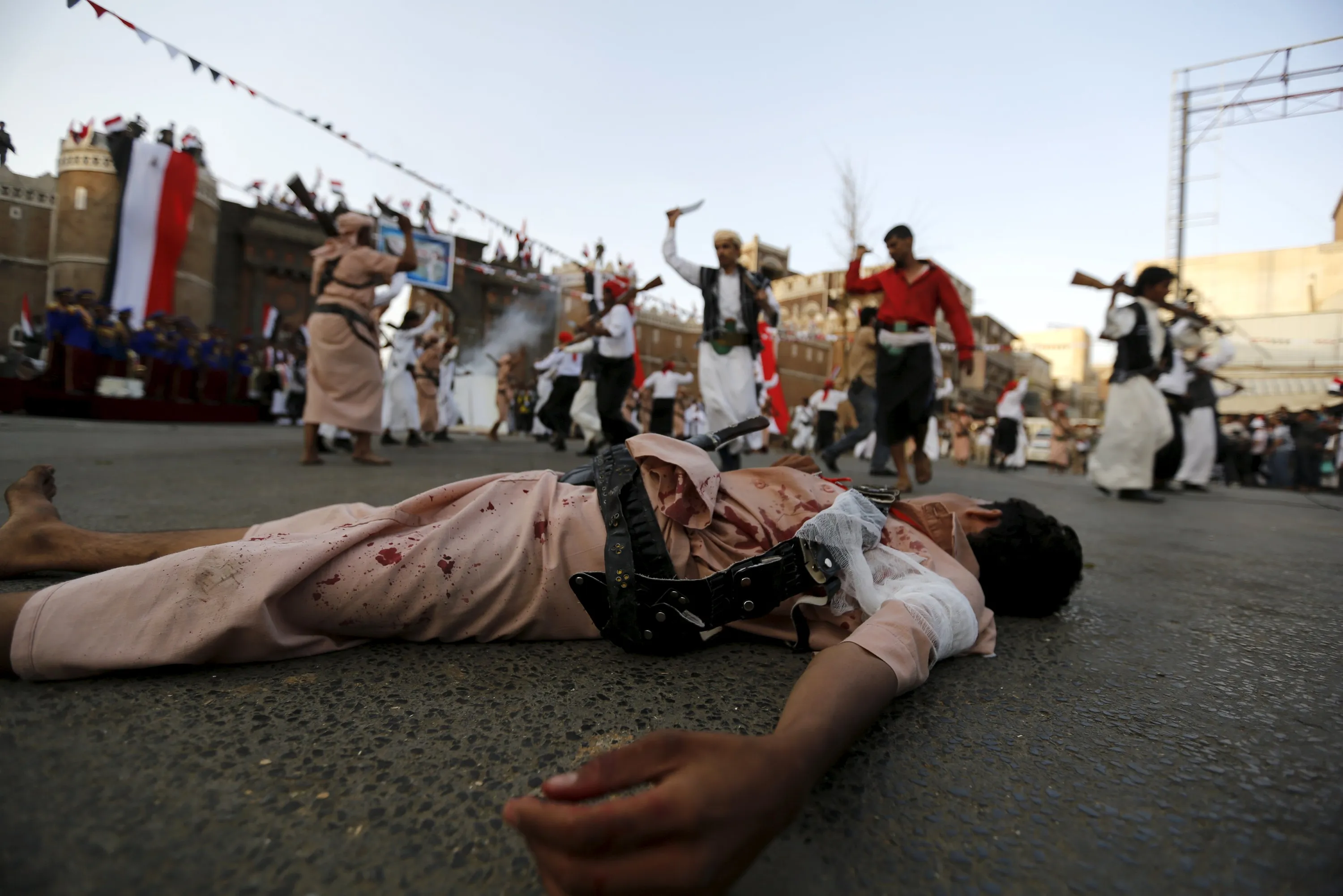 A Houthi follower with fake blood on his clothes lies on the ground to represent a victim as others perform a war dance during a ceremony marking the first anniversary of the Houthi movement's takeover of Yemen's capital Sanaa September 21, 2015. (Photo by Khaled Abdullah/Reuters)