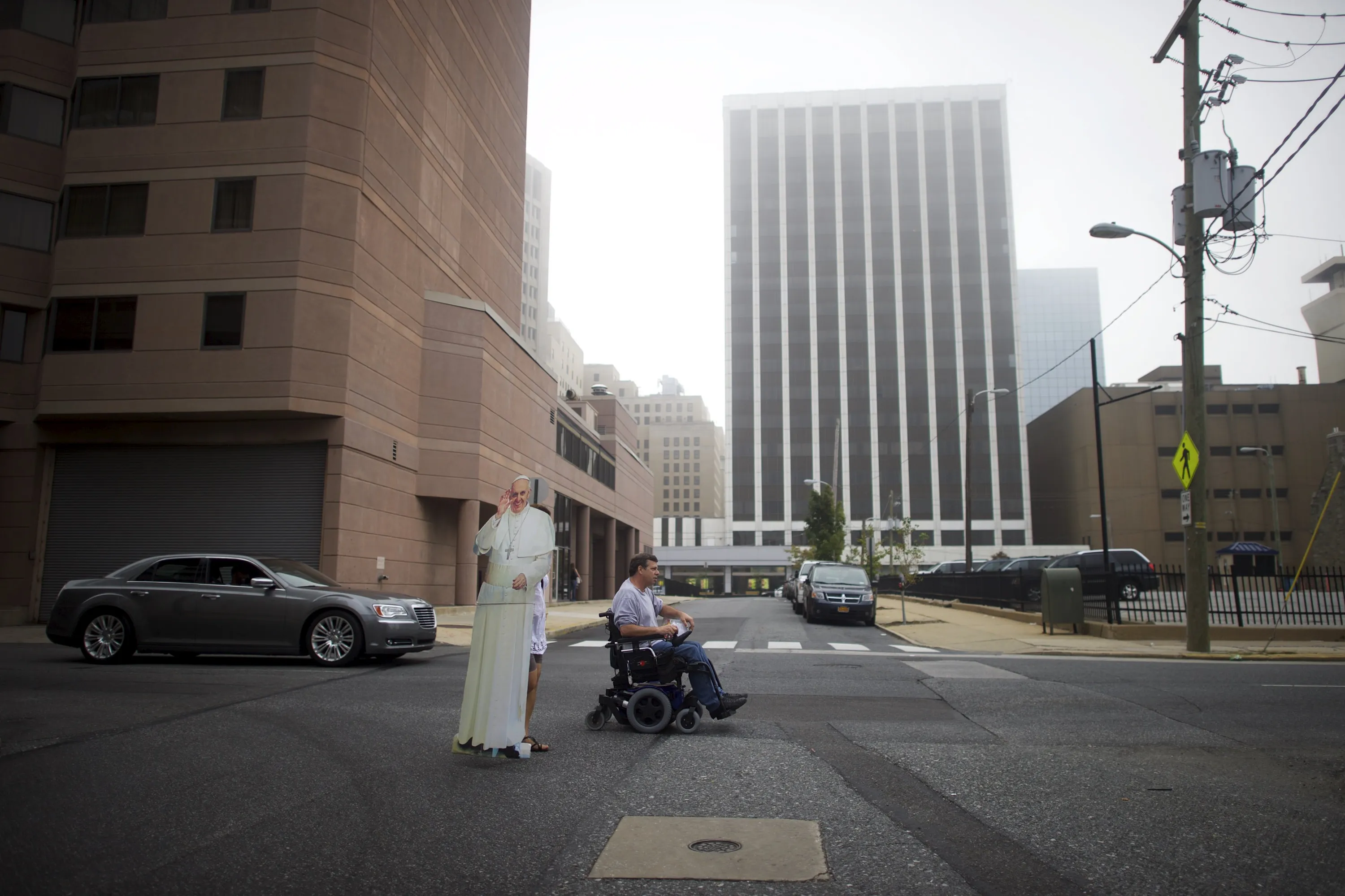 Christa Scalies (L), behind a cardboard cut-out of Pope Francis, and Paul Tanner, the creators of Pop-Up Pope, make their way along a street in Wilmington, Delaware, September 19, 2015. (Photo by Mark Makela/Reuters)