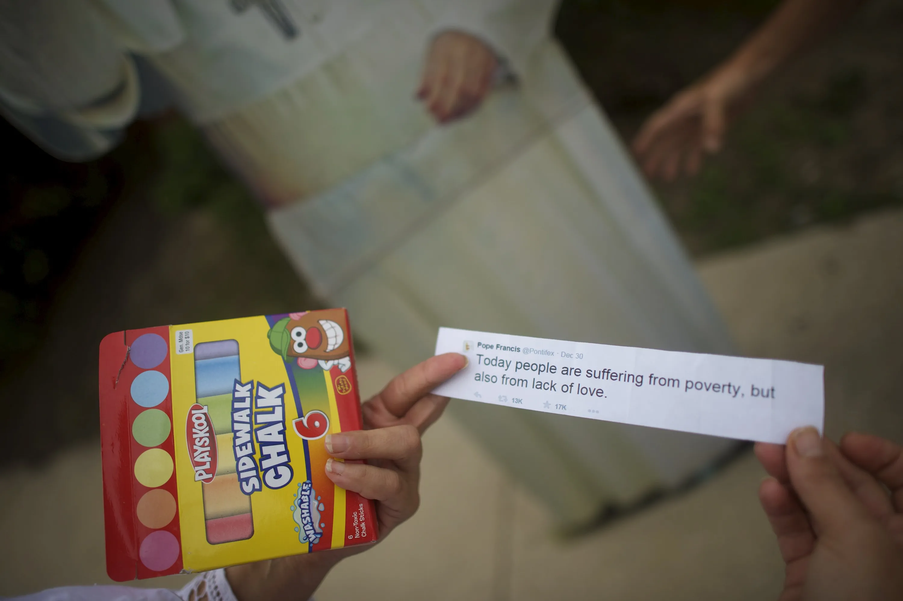 Christa Scalies, the co-creator of the Pop-Up Pope, holds a printed tweet from Pope Francis in Wilmington, Delaware, September 19, 2015. (Photo by Mark Makela/Reuters)