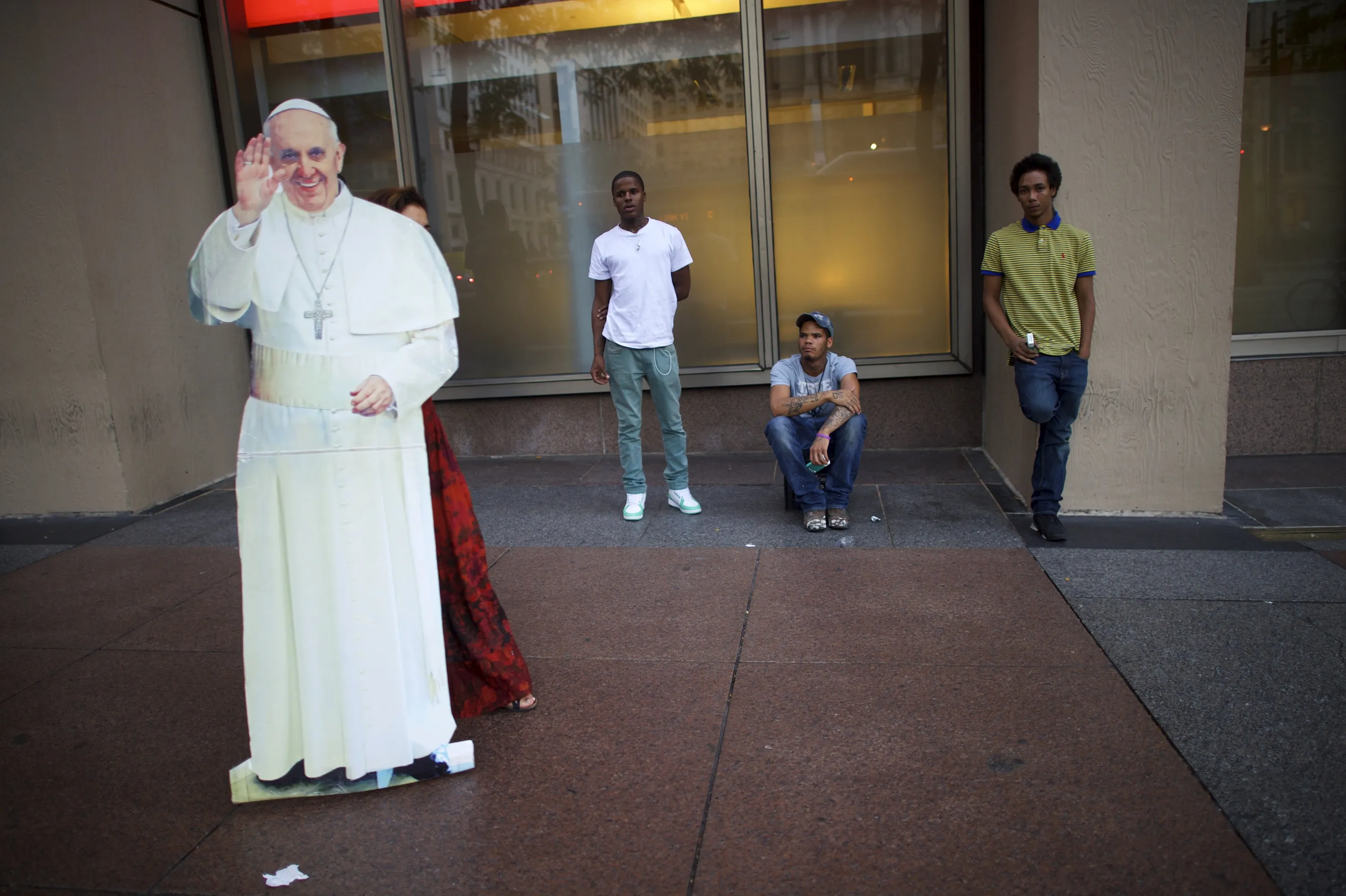 Christa Scalies, the co-creator of the Pop-Up Pope, can be seen behind a cardboard cut-out of Pope Francis as she walks through the city center in Philadelphia, Pennsylvania, September 16, 2015. (Photo by Mark Makela/Reuters)