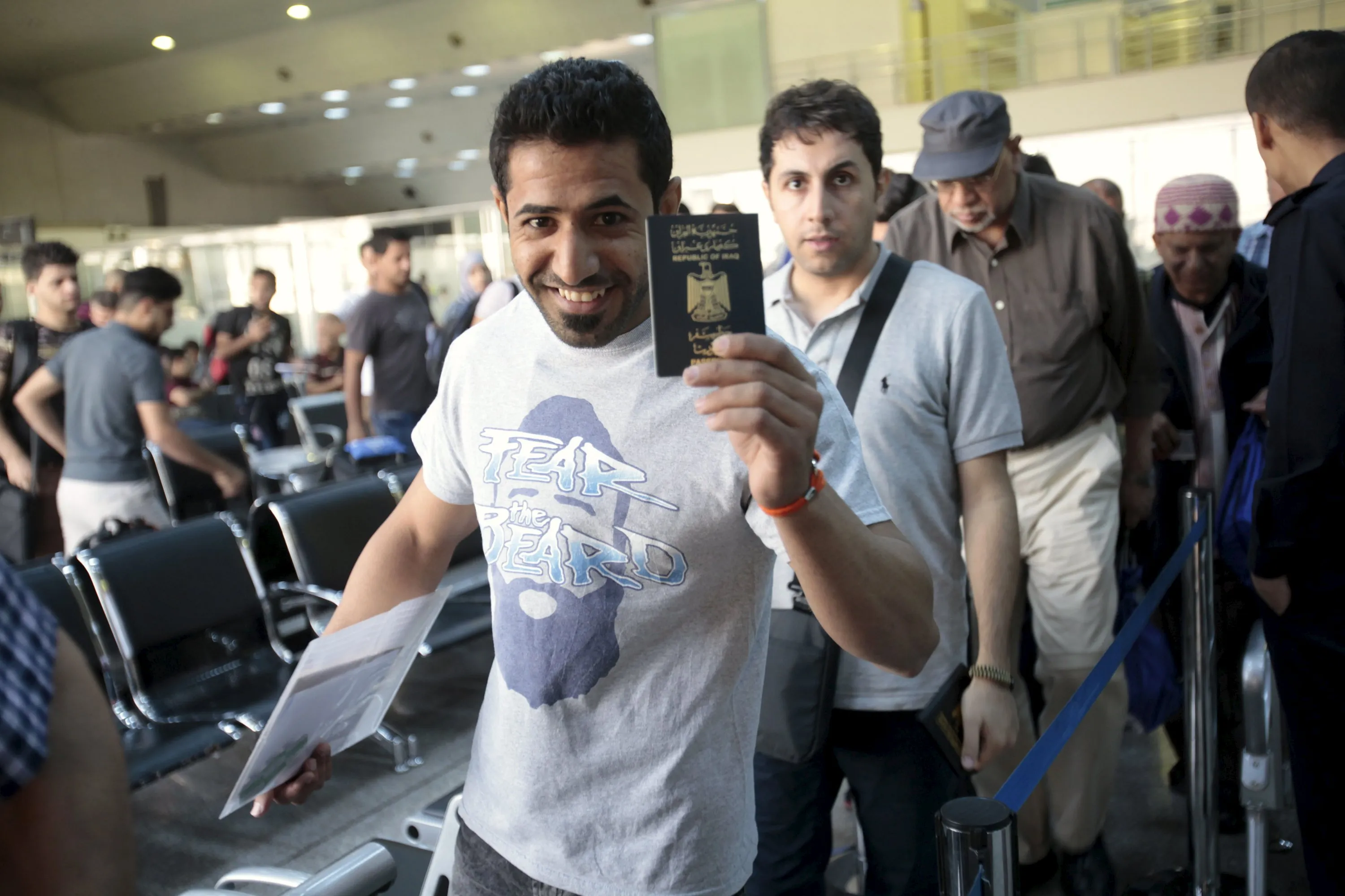 A member of the Iraqi security forces shows his passport as he prepares to travel, at the international airport in Najaf, south of Baghdad, September 3, 2015. Some Iraqi soldiers are abandoning their posts and joining a wave of civilian migrants headed to Europe, raising new doubts about the cohesion of the country's Western-backed security forces in the fight against Islamic State militants. Picture taken September 3, 2015. (Photo by Alaa Al-Marjani/Reuters)