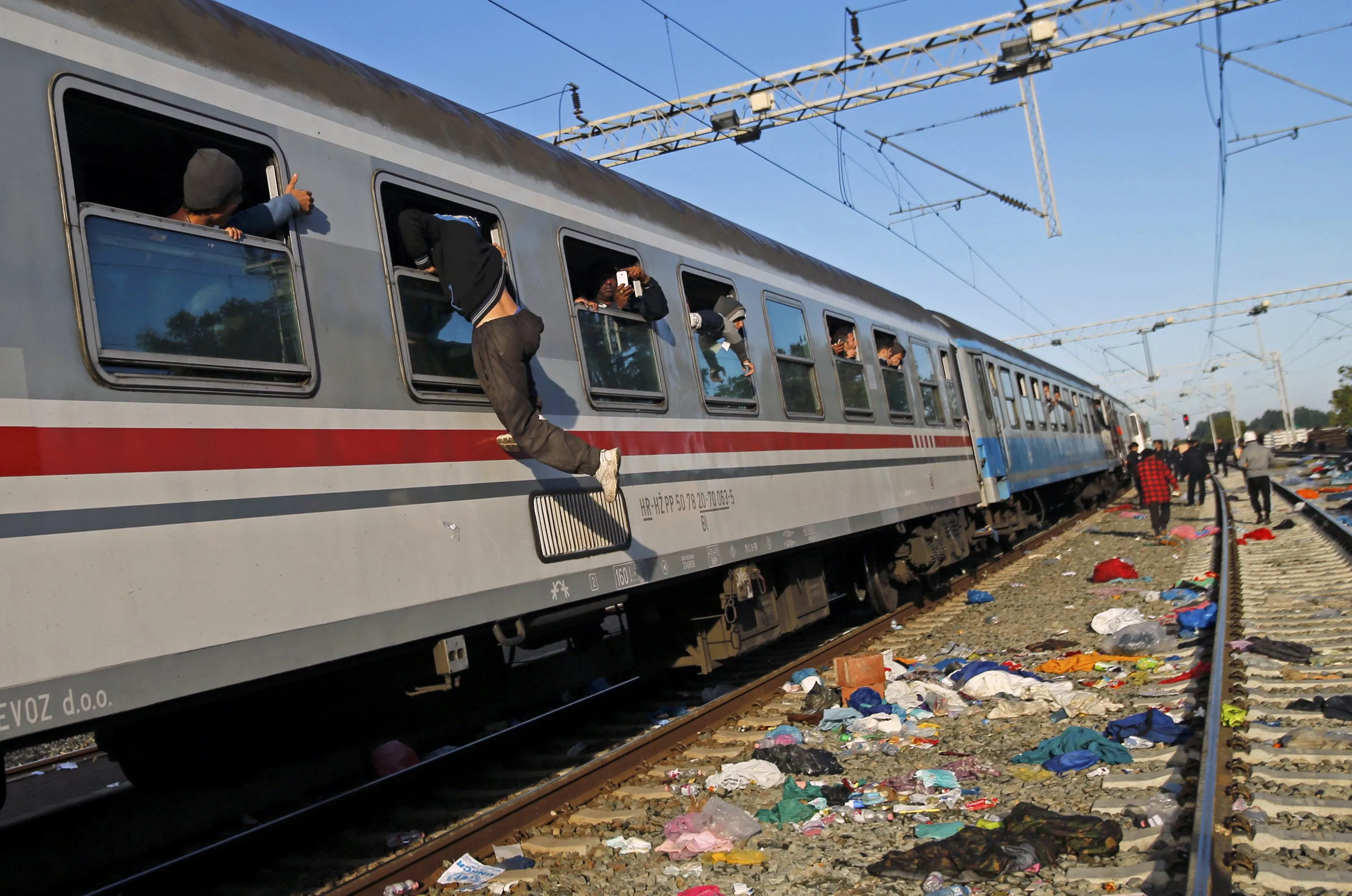 A migrant jumps through a train window at the railway station in Tovarnik, Croatia September 21, 2015. (Photo by Antonio Bronic/Reuters)