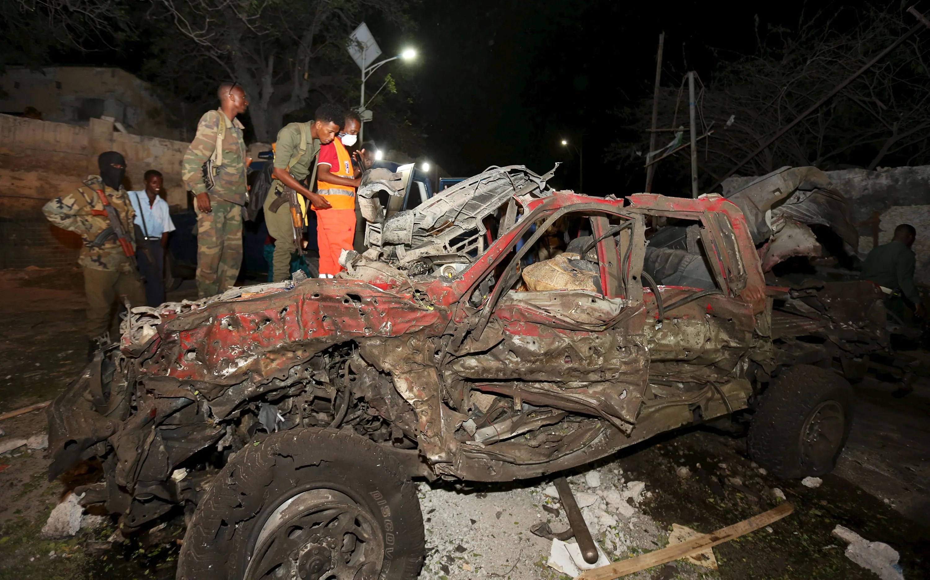 Somali government soldiers look at the wreckage of a car at the scene of an explosion in front of the presidential palace in the capital Mogadishu, September 21, 2015. At least five people were killed when a car bomb exploded close to the presidential palace in Somalia's capital Mogadishu on Monday, police said. (Photo by Feisal Omar/Reuters)