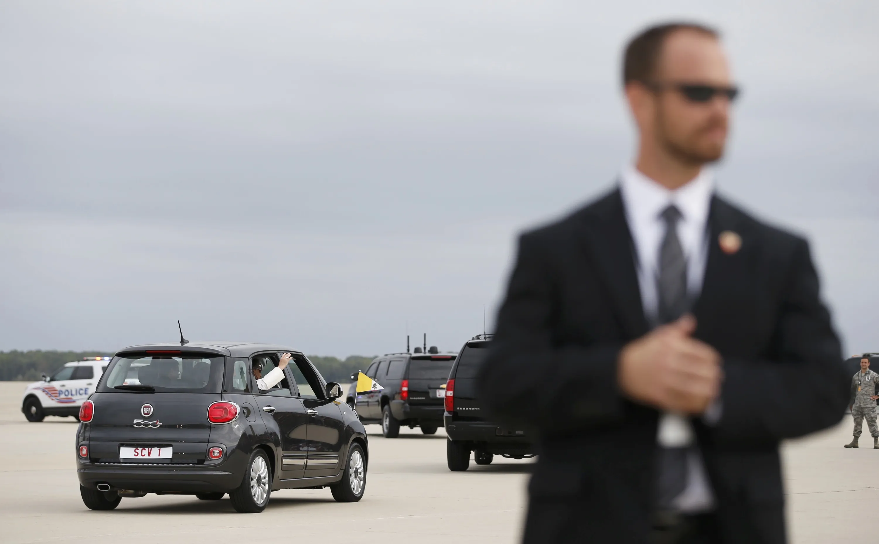 With Secret Service personnel looking on, Pope Francis waves on departure at Joint Base Andrews, Maryland in a Fiat 500 after arriving for his first trip to the U.S. September 22, 2015. (Photo by Kevin Lamarque/Reuters)