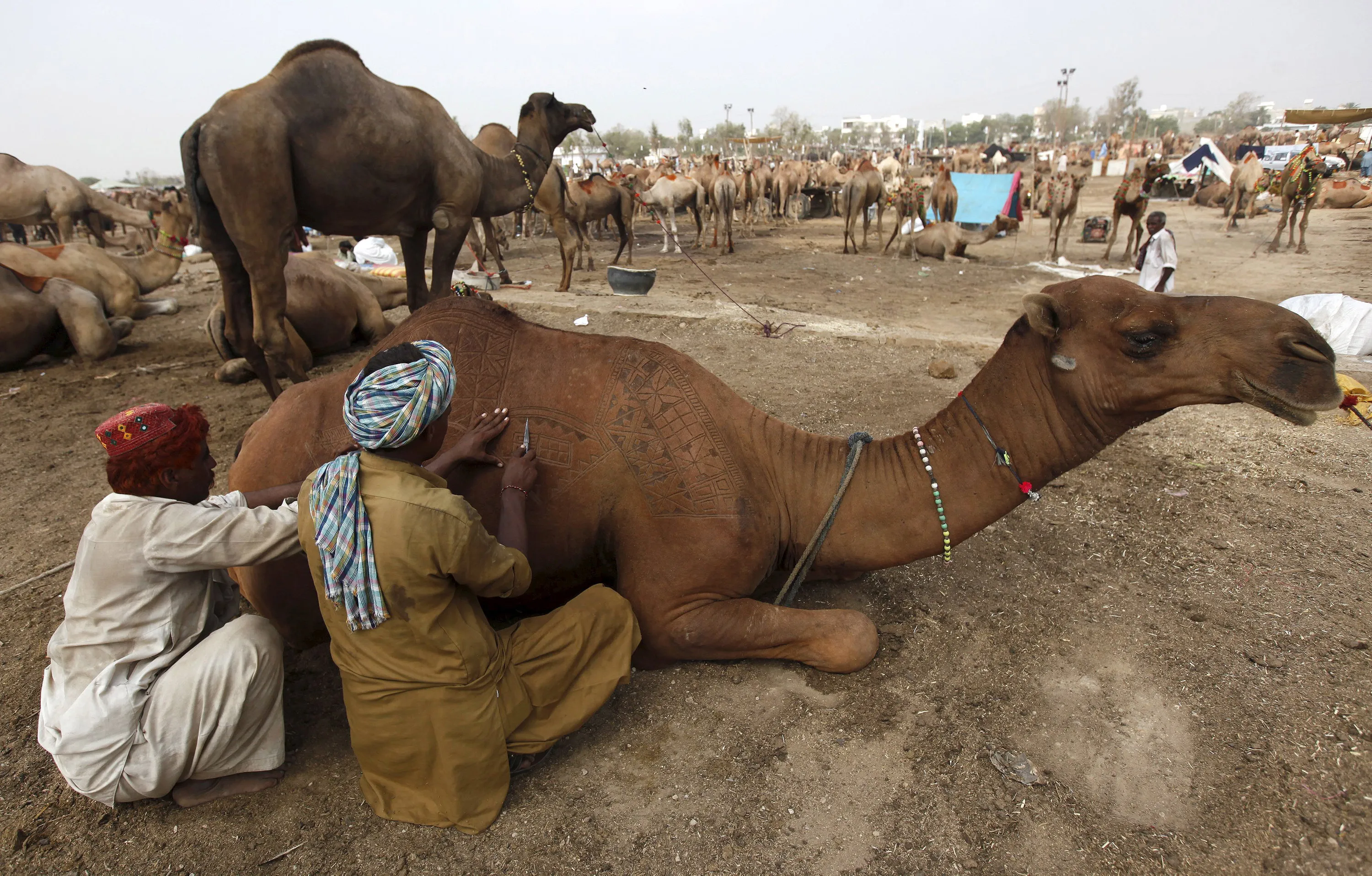 Men use scissors to cut the hair of a camel to make intricate decorative patterns at the animal market on the outskirts of Karachi, Pakistan, September 21, 2015. (Photo by Akhtar Soomro/Reuters)