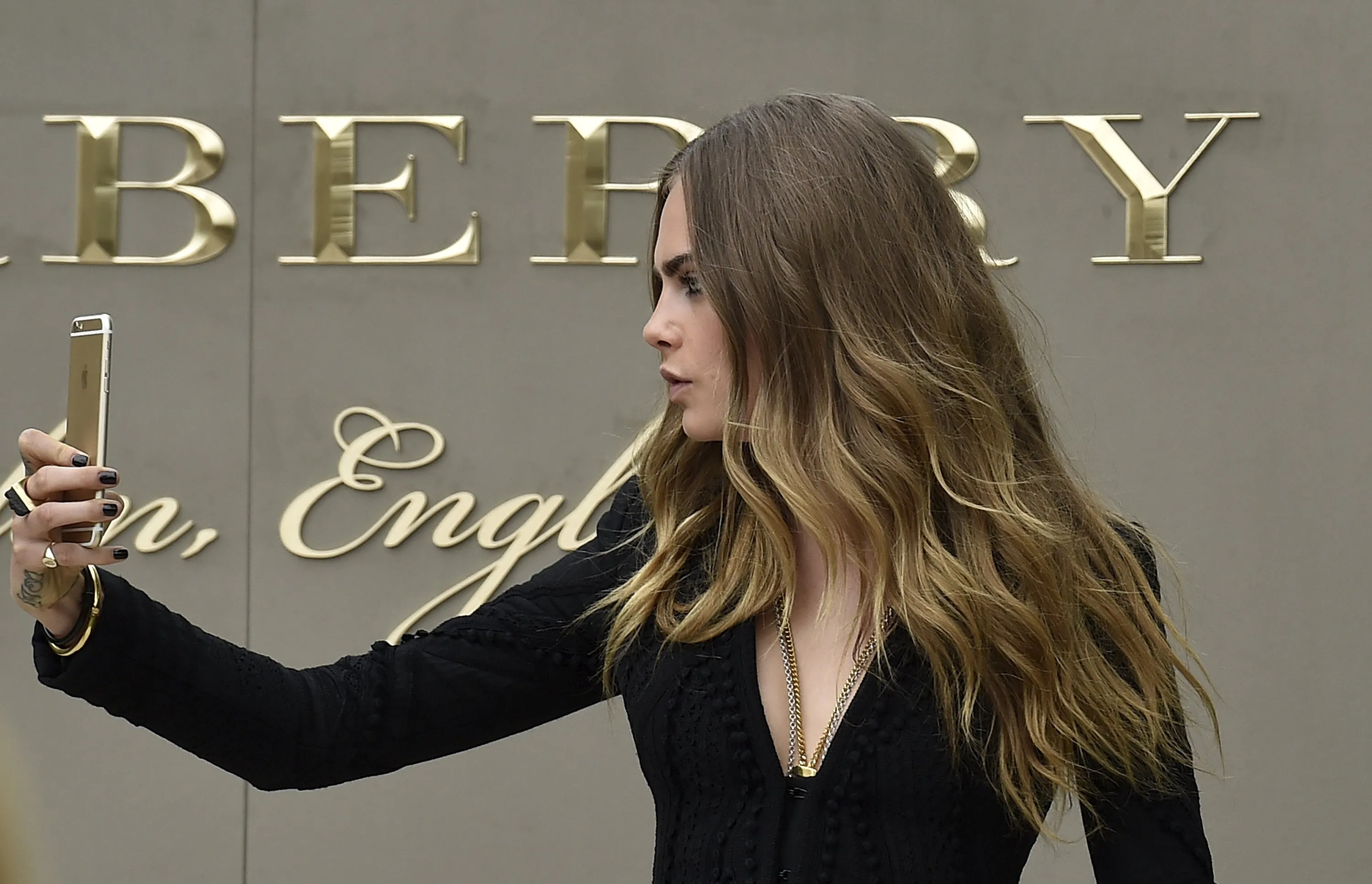 British model Cara Delevingne takes a selfie as she arrives for the Burberry Spring/Summer 2016 collection during London Fashion Week September 21, 2015. (Photo by Toby Melville/Reuters)