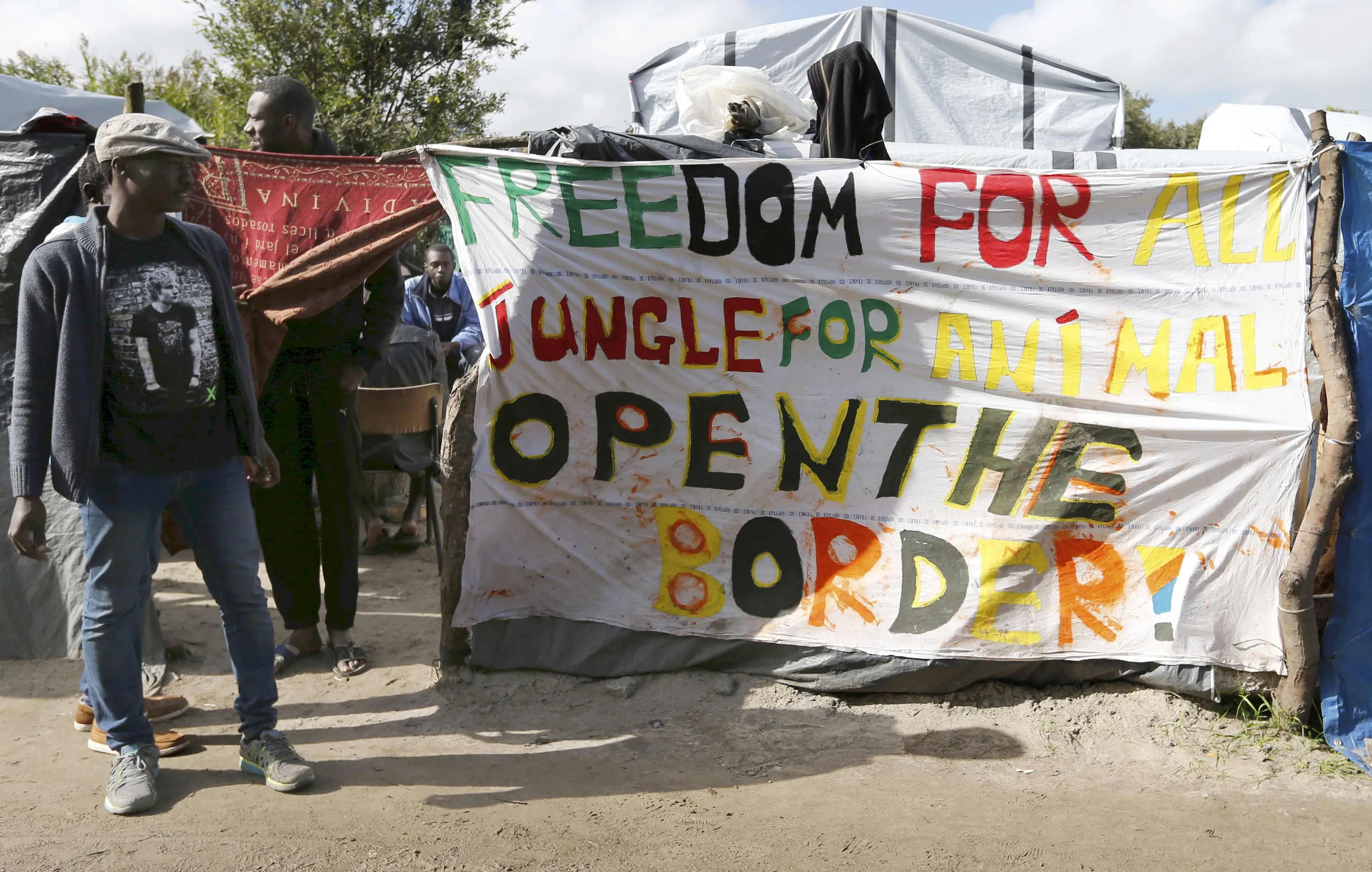 Migrants stand near a banner which reads “Freedom for all. Jungle for animal. Open the border” at the makeshift camp called “The New Jungle” in Calais, France, September 19, 2015. (Photo by Regis Duvignau/Reuters)