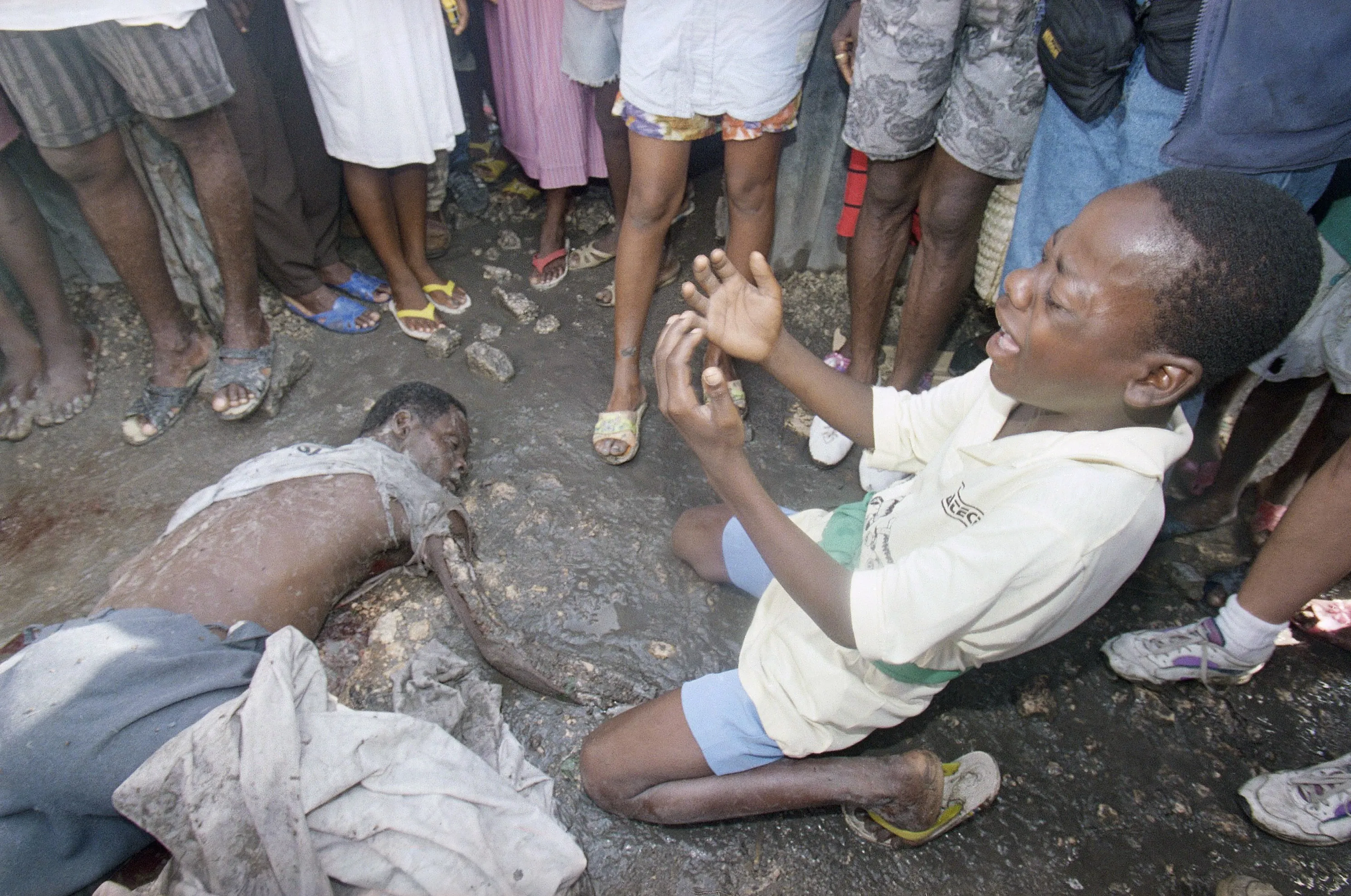 Roulio Cadet grieves over the body of his murdered father after discovering him in the Cite Soleil section of Port-au-Prince, Sunday, September 25, 1994. The man, 45-year-old Verdieu Cadet, whose body had been mutilated and had bullet wounds, appeared to have been killed by unknown assailants overnight after a pro-Aristide demonstration. (Photo by Rick Bowmer/AP Photo)