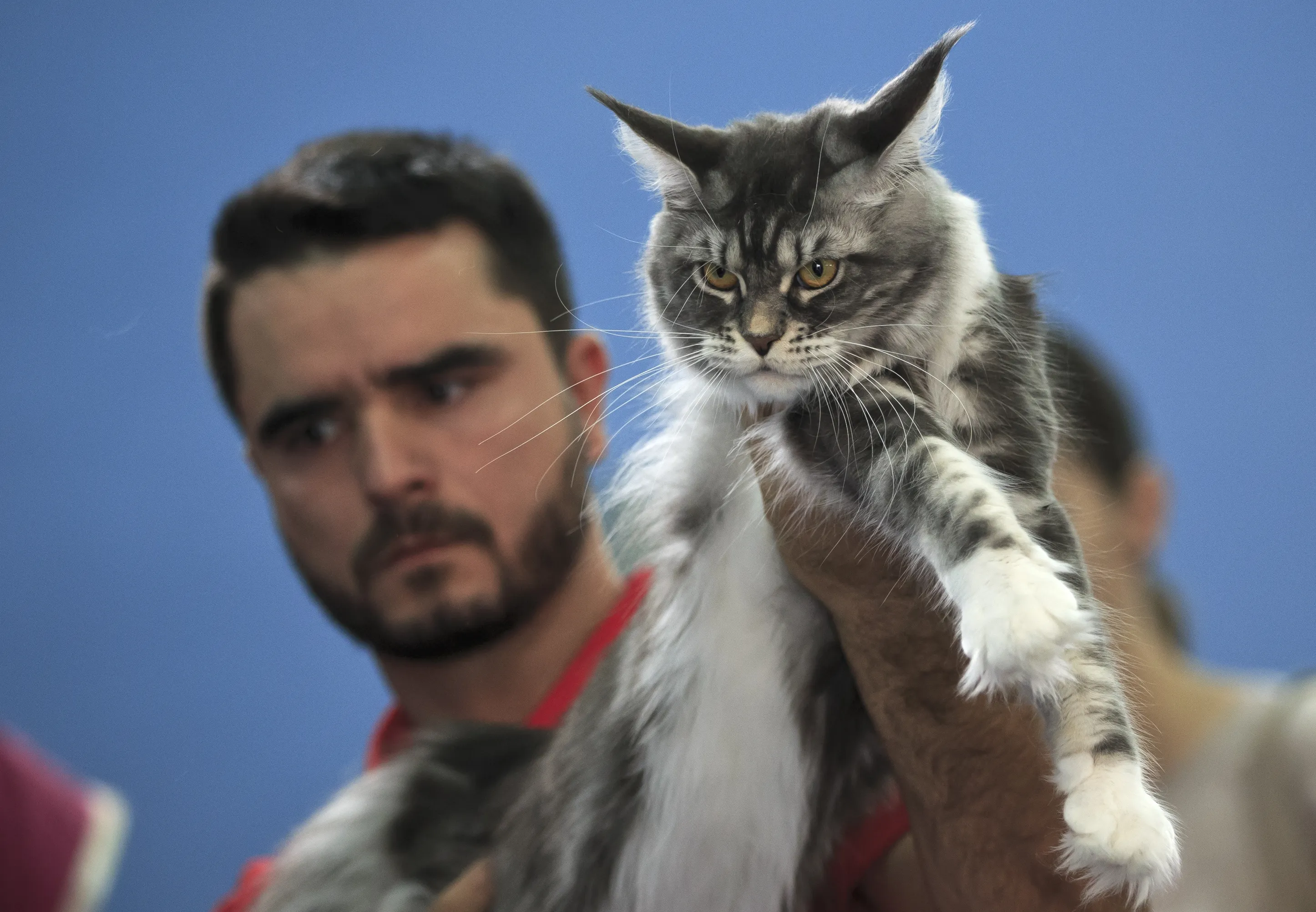 A Maine Coon cat is held before a judge during a competition in Bucharest, Romania, Saturday, September 26, 2015. (Photo by Vadim Ghirda/AP Photo)