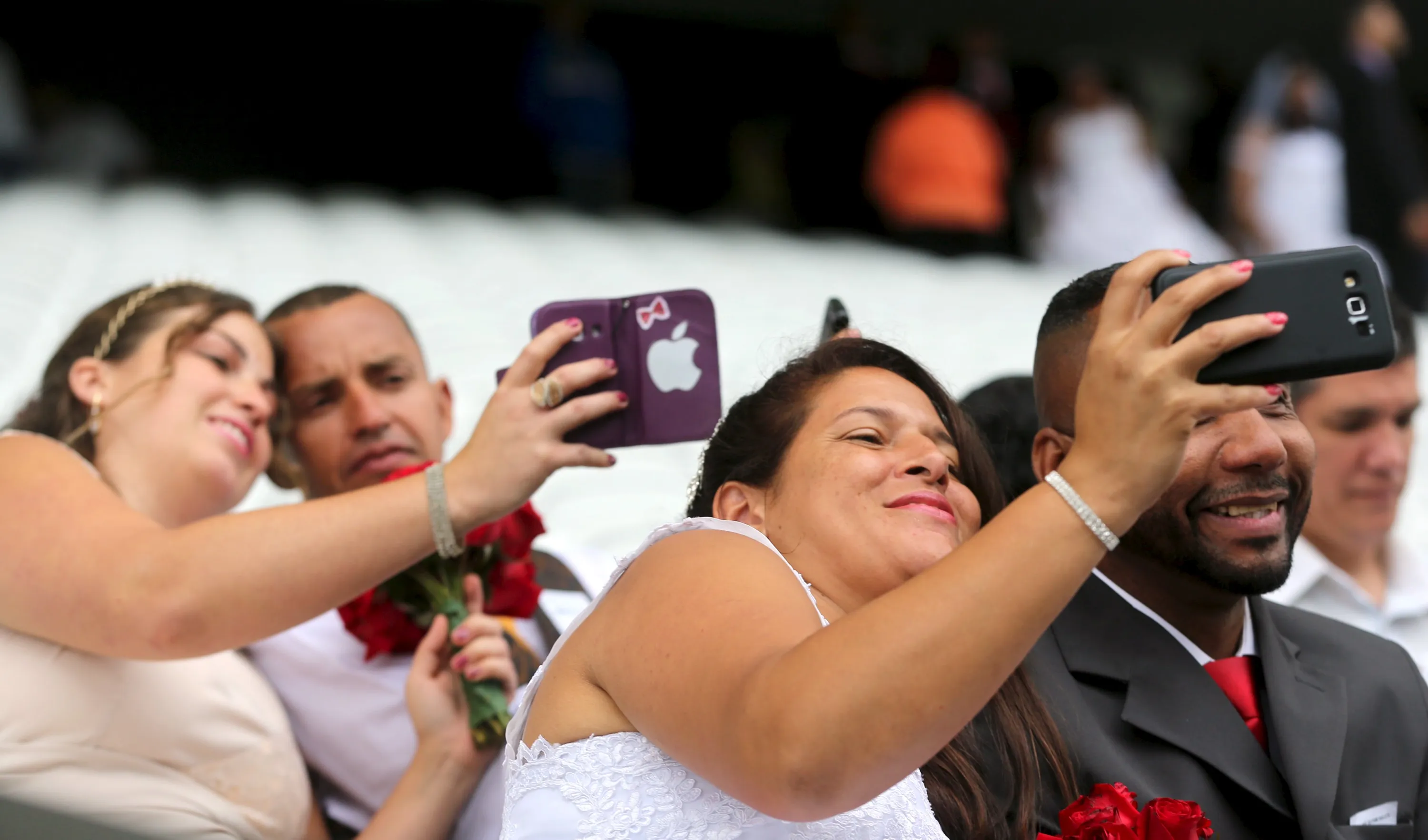 Couples take selfies during a mass wedding ceremony at Arena Corinthians soccer stadium in Sao Paulo, Brazil, September 26, 2015. (Photo by Paulo Whitaker/Reuters)