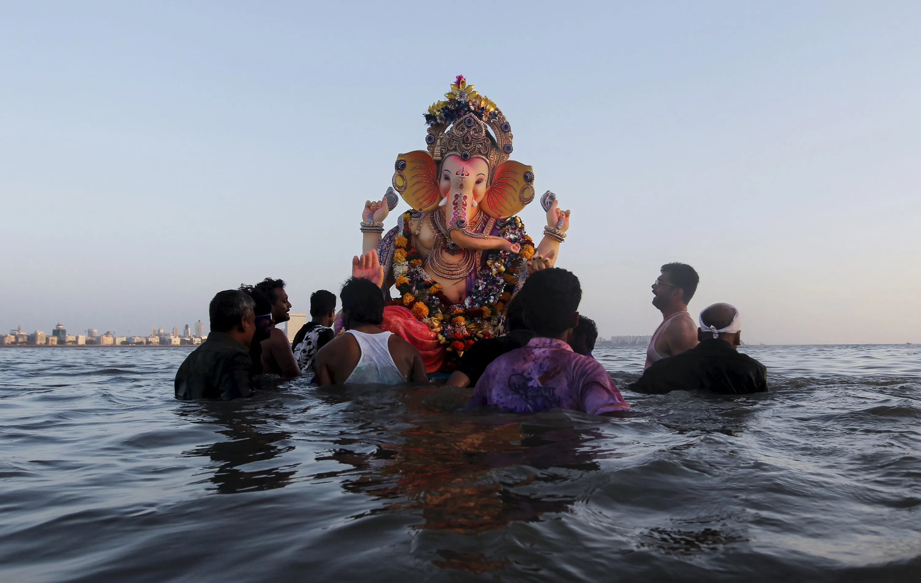 Devotees carry an idol of Hindu elephant god Ganesh, the deity of prosperity, for immersion into the Arabian Sea on the last day of the Ganesh Chaturthi festival in Mumbai, India, September 27, 2015. (Photo by Danish Siddiqui/Reuters)