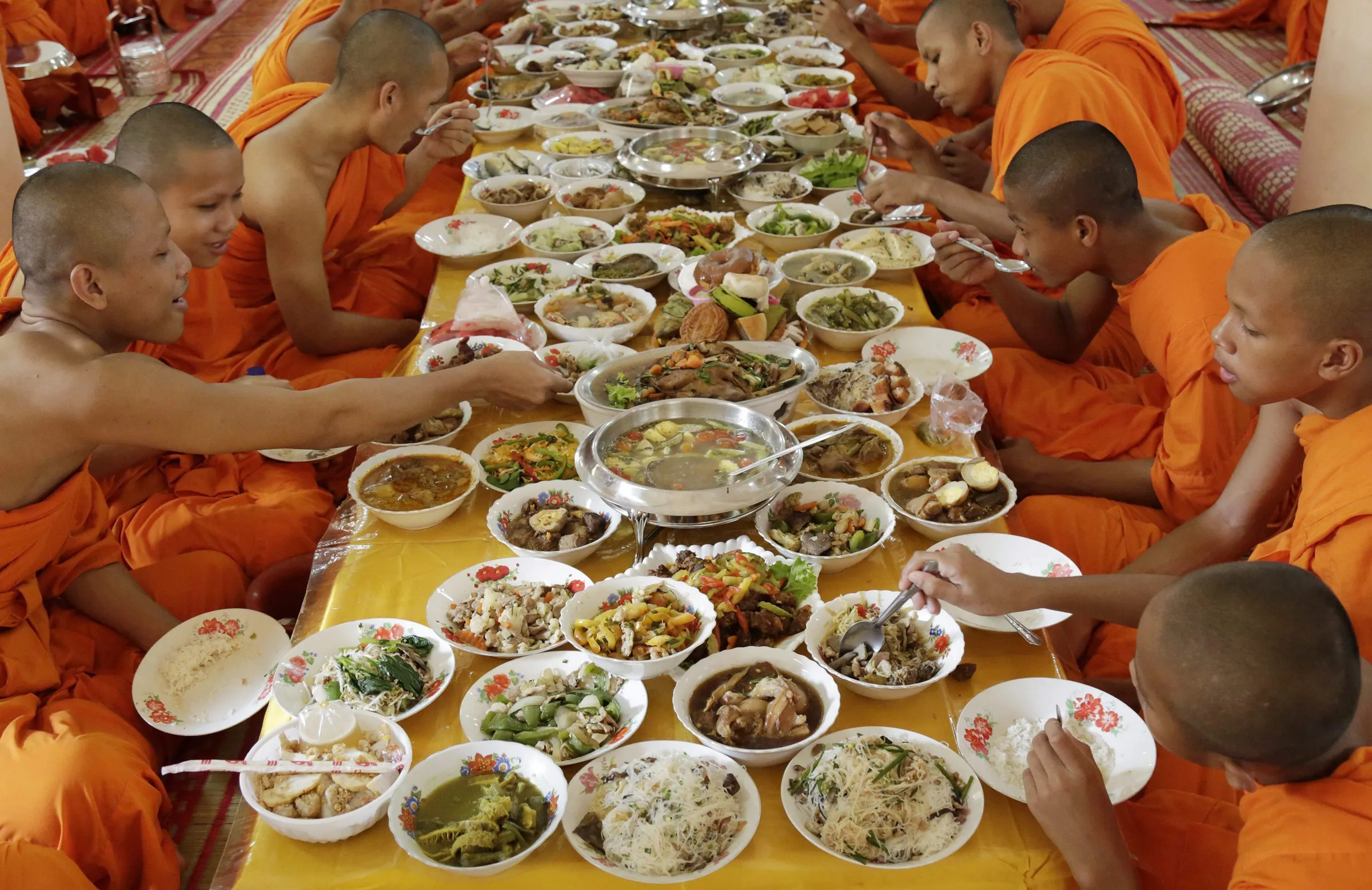 Cambodian Buddhist monks enjoy their lunch during the Day of the Dead (Ancestors' Day), at a pagoda in Phnom Penh, Cambodia, 28 September 2015. Cambodia celebrates the Festival of Death from 28 September to 12 October 2015. During these 15 days, many Cambodians go to pagodas, bring food and other offerings to Buddhist monks and visit their families. (Photo by Mak Remissa/EPA)