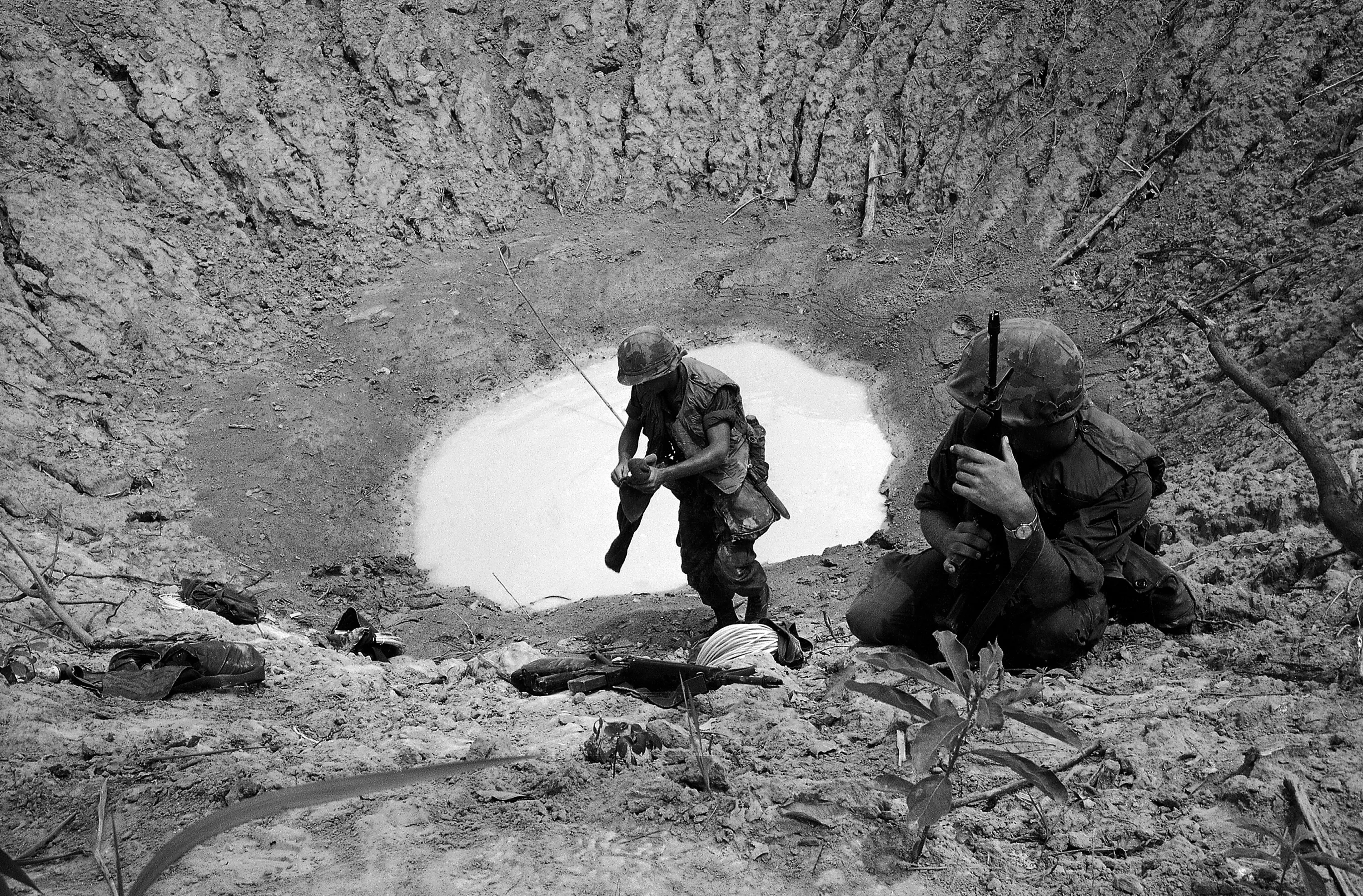 Soldiers of the 25th Infantry Division take shelter in crater caused by bomb from a B52 in the Ho Bo Woods, some 25 miles northwest of Saigon in South Vietnam on September 29, 1967. The division, supported by strikes from the B52 bombers, has been clearing 18,000 acres of the woods in effort to rout entrenched enemy. (Photo by Dang Van Phuoc/AP Photo)