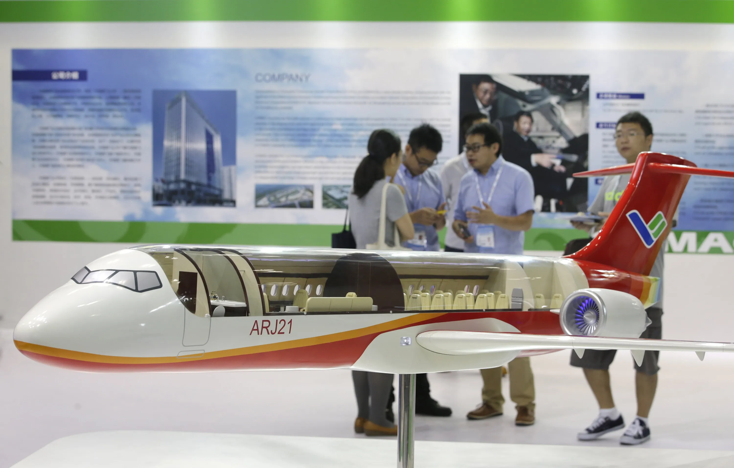 A model of the ARJ21 regional jet from Commercial Aircraft Corp of China (COMAC) is displayed at the Aviation Expo China 2015 in Beijing, China, September 16, 2015. Chinese state-owned plane maker COMAC said on Wednesday it has signed an initial agreement with lessor ICBC Financial Leasing Co to lease 10 COMAC ARJ21 regional jets and 10 of its C919 single-aisle commercial jets to Thai airline City Airways. (Photo by Jason Lee/Reuters)