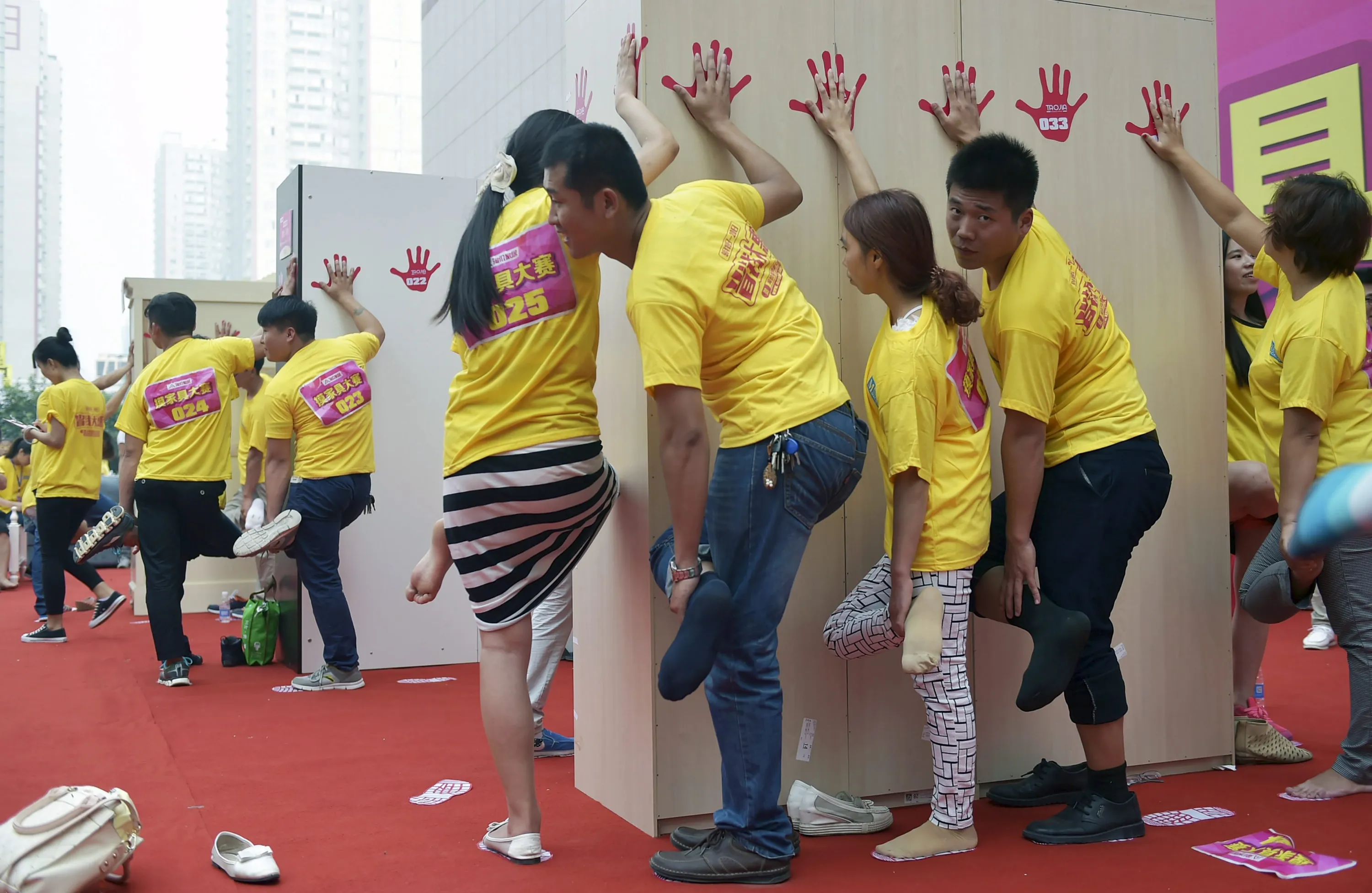 Contestants participate in an endurance competition by putting one hand on a piece of furniture while standing on one leg, at a furniture department store in Luoyang, Henan province, China, September 19, 2015. The last 10 people who held on for over three hours were each rewarded a piece of furniture, local media reported. (Photo by Reuters/China Daily)