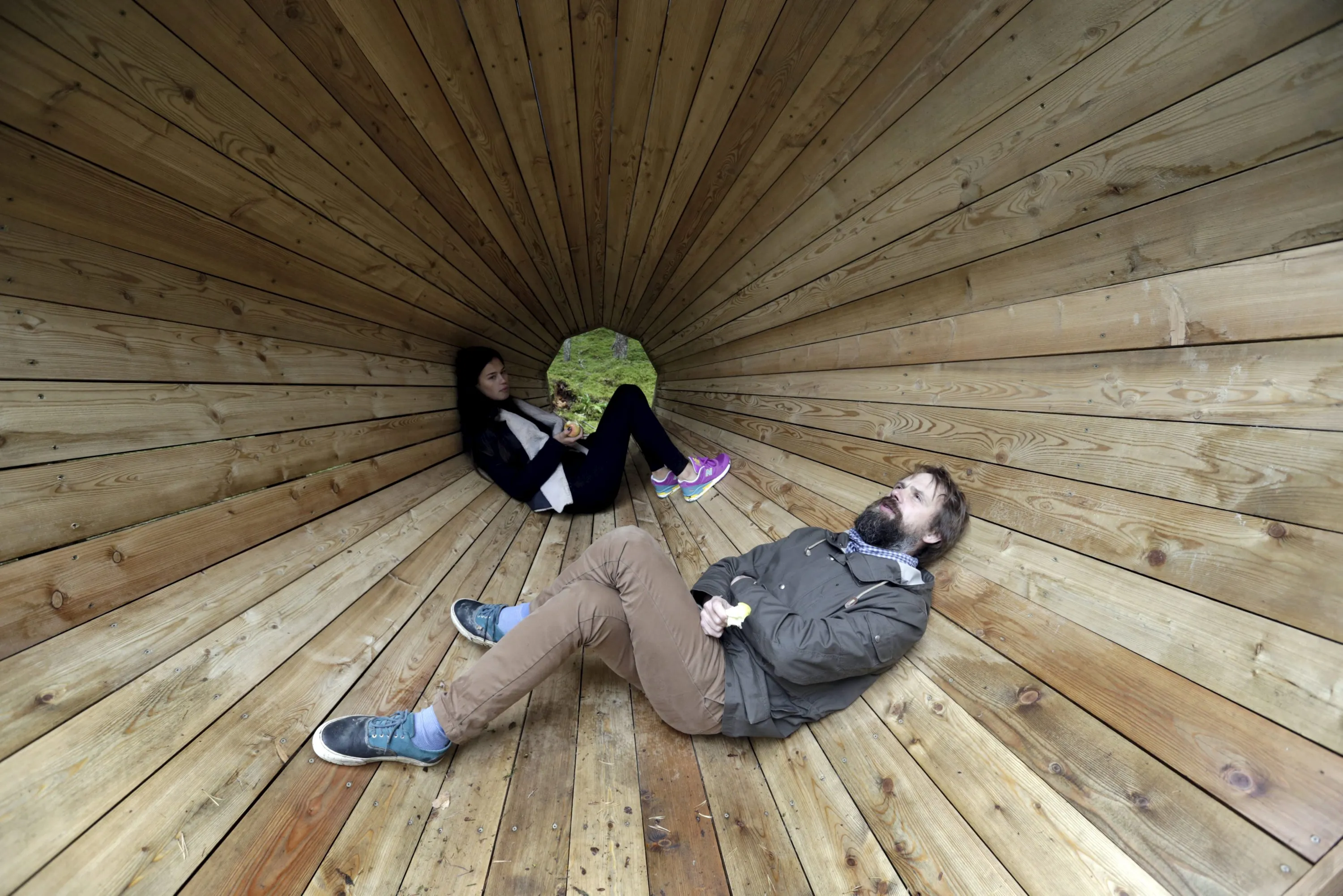 Head of the department of the interior architecture at Estonian Academy of Arts Hannes Praks (R) and student Birgit Oigus pose for a picture in the wooden megaphone in the forest near Pahni village, Estonia, September 28, 2015. (Photo by Ints Kalnins/Reuters)