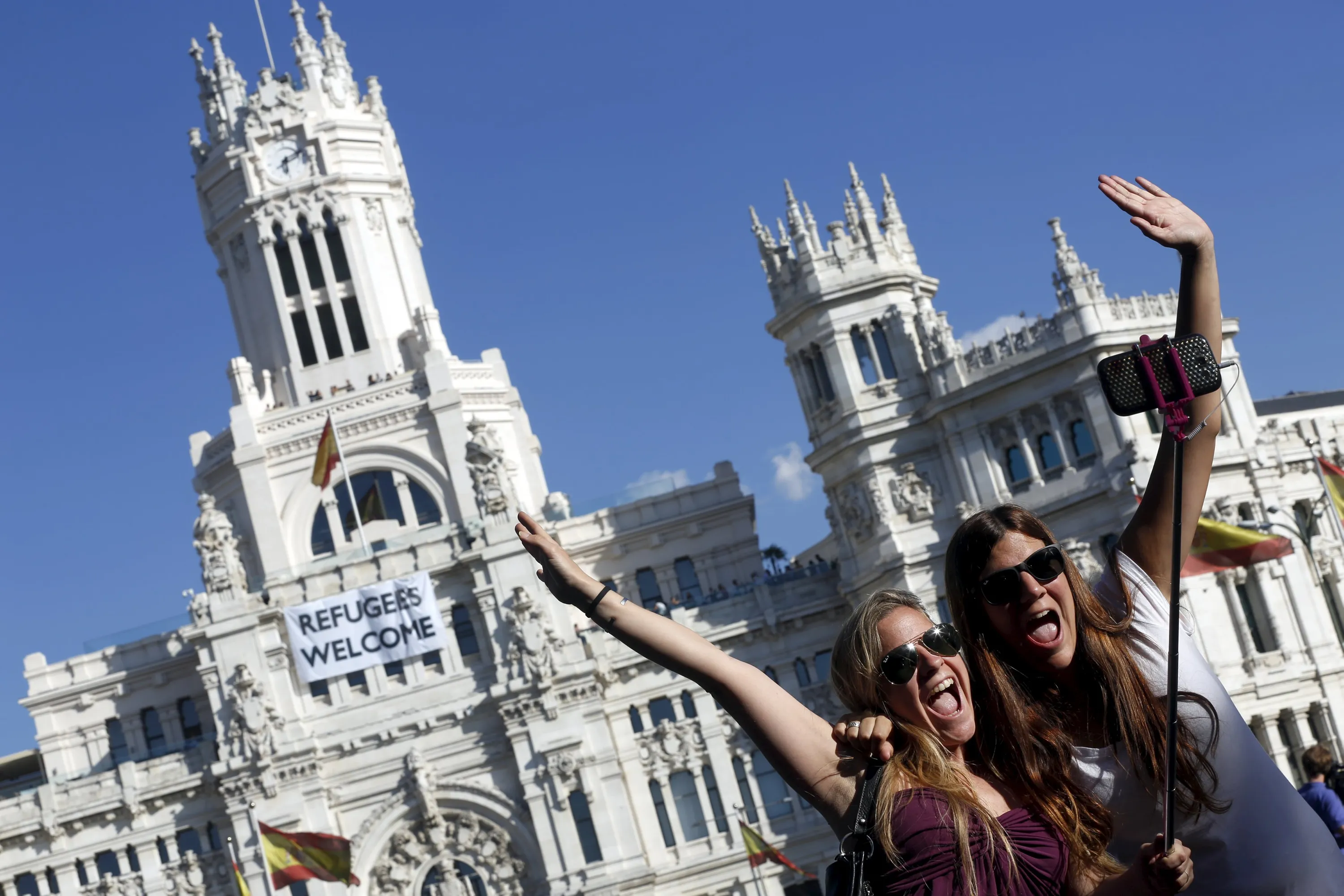 Two women take a selfie outside Madrid's Town Hall, where a banner welcoming refugees is displayed, in Madrid, Spain, September 8, 2015. (Photo by Susana Vera/Reuters)