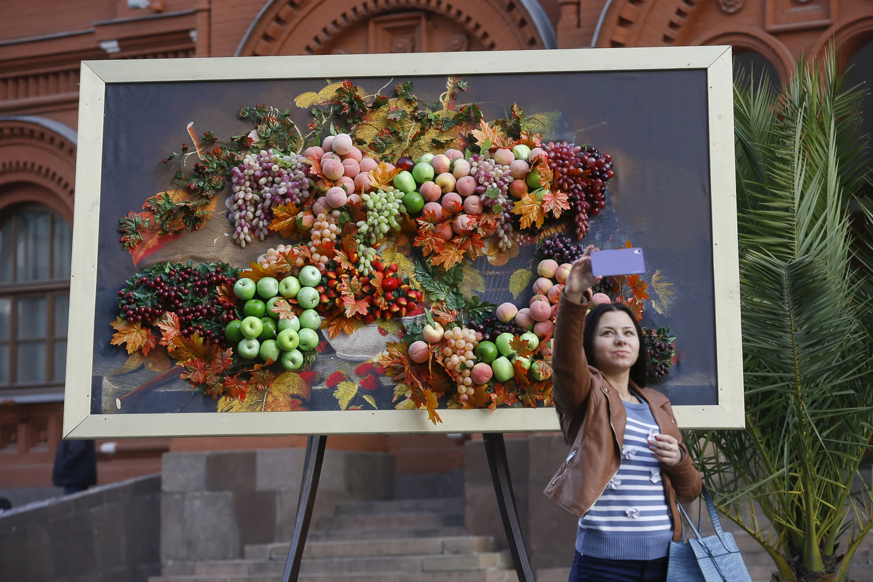 A woman takes a selfie in front of an art installation made of artificial fruits and vegetables during the “Moscow Autumn” festival in central Moscow, September 14, 2015. (Photo by Maxim Zmeyev/Reuters)