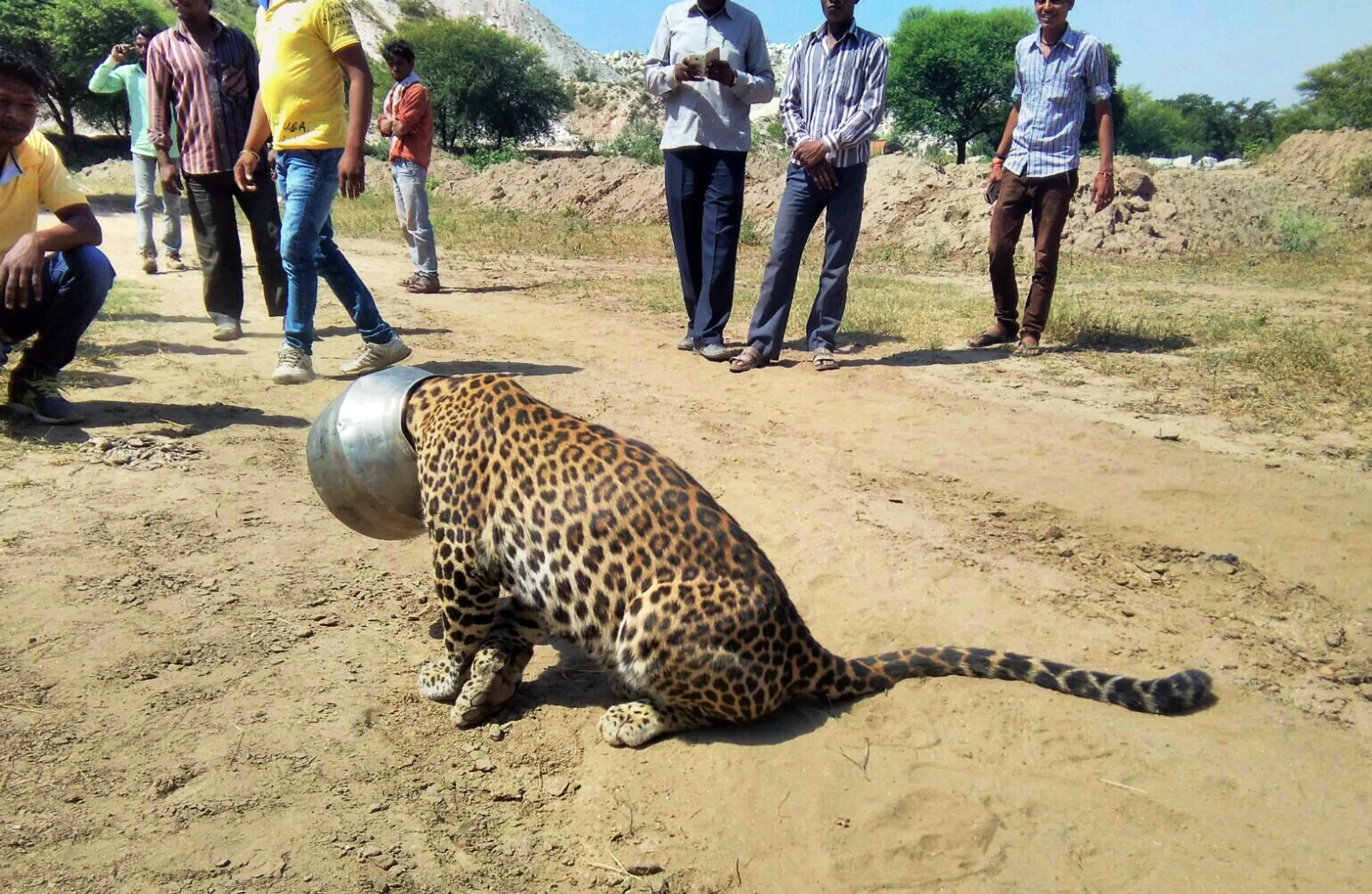 People stand around a leopard with its head stuck in a vessel in Rajsamand district of Rajasthan state, India, Wednesday, September 30, 2015. The leopard's head got stuck when it attempted to drink water from the pot, according to news reports. Forest officials tranquilized the animal and sawed off the vessel later in the day. (Photo by Kabir Jethi/AP Photo)