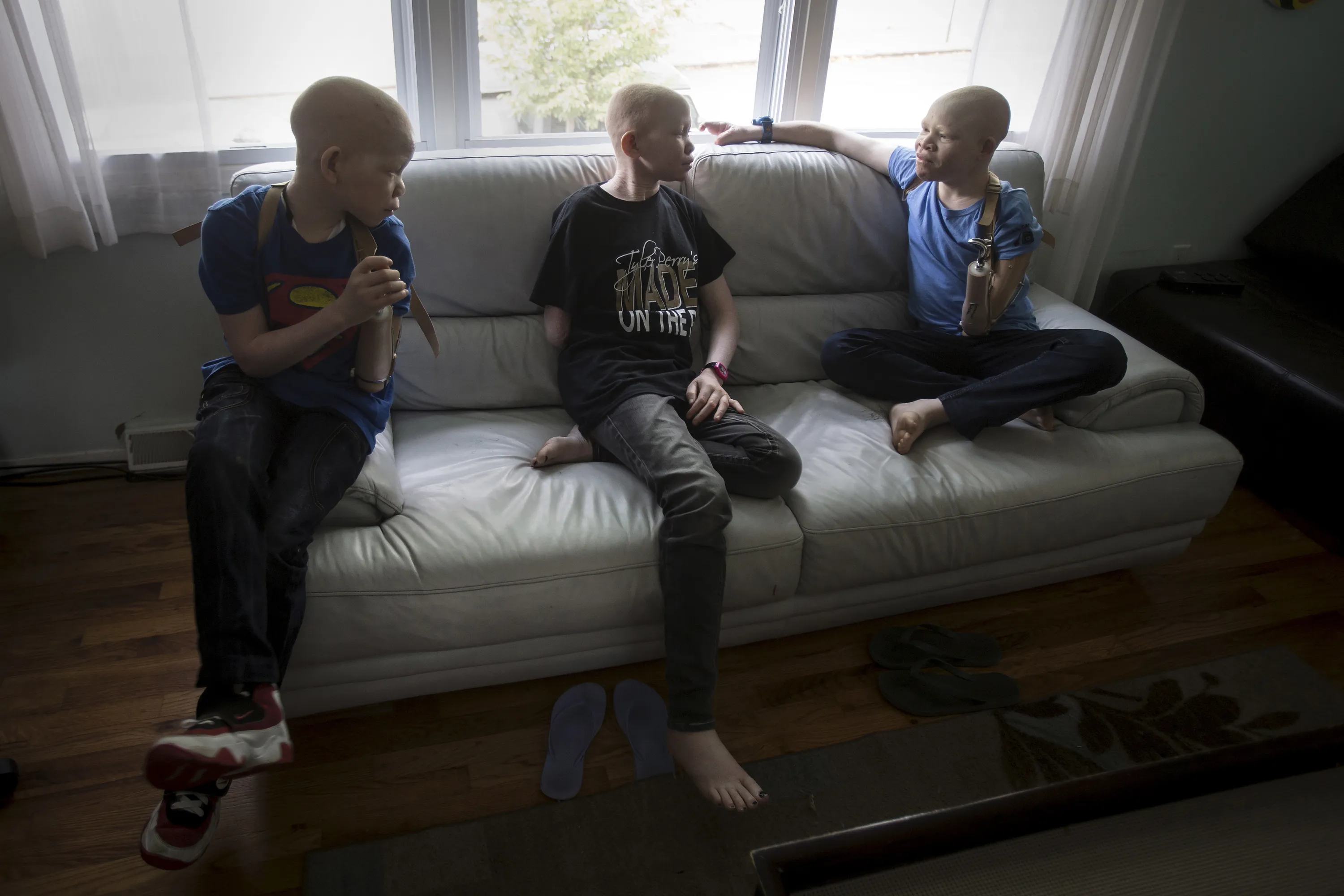 Mwigulu Matonage (L), Pendo Sengerema (C) and Emmanuel Festo (R) sit on a sofa. (Photo by Carlo Allegri/Reuters)