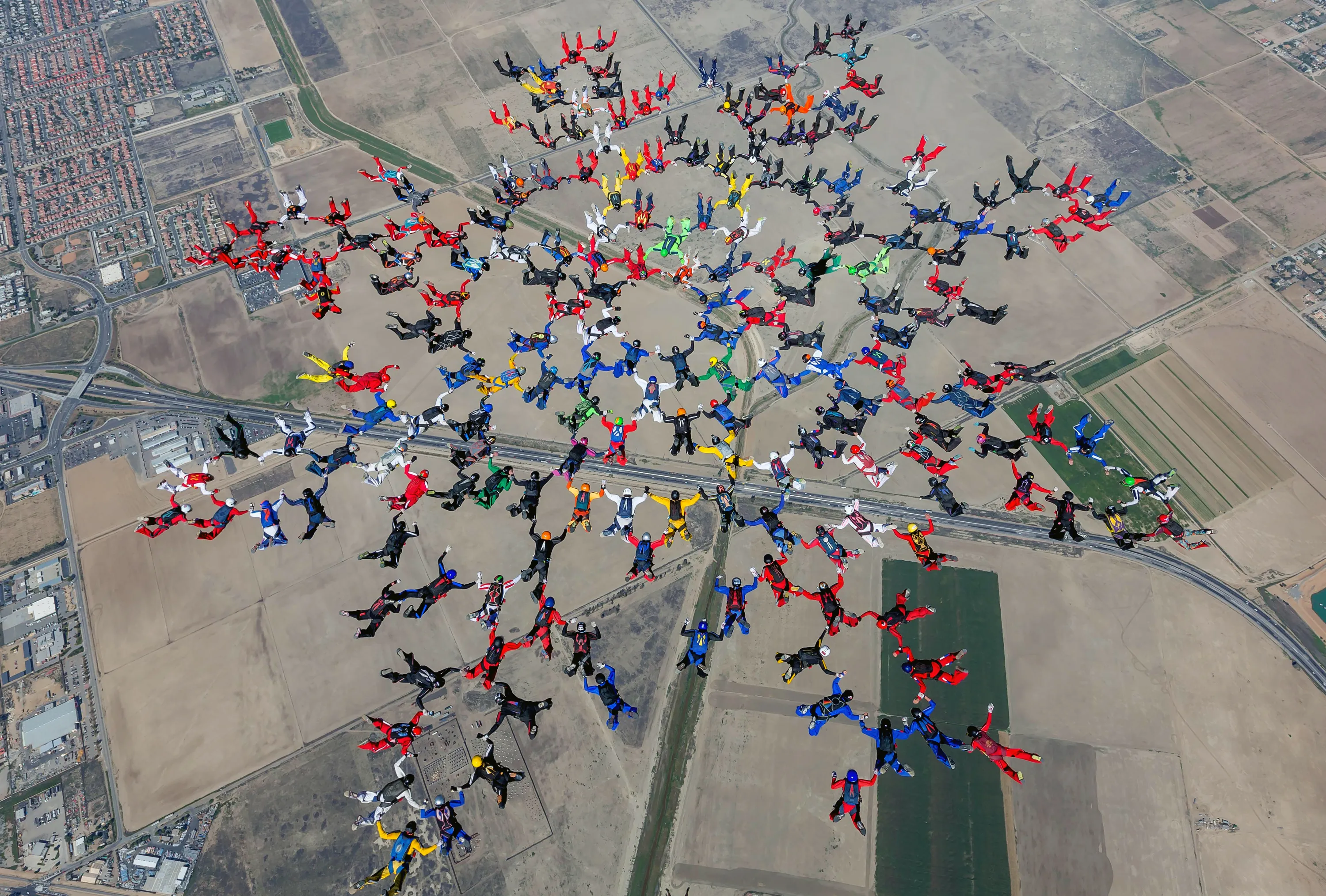 This Tuesday, September 29, 2015 photo provided by Craig O'Brien shows a record-breaking skydiving formation above Perris, Calif. Two-hundred-and-two skydivers from around the world set the record when they all linked up thousands of feet above Southern California. The group formed the largest sequential skydiving formation. (Photo by Craig O'Brien/AP Photo)