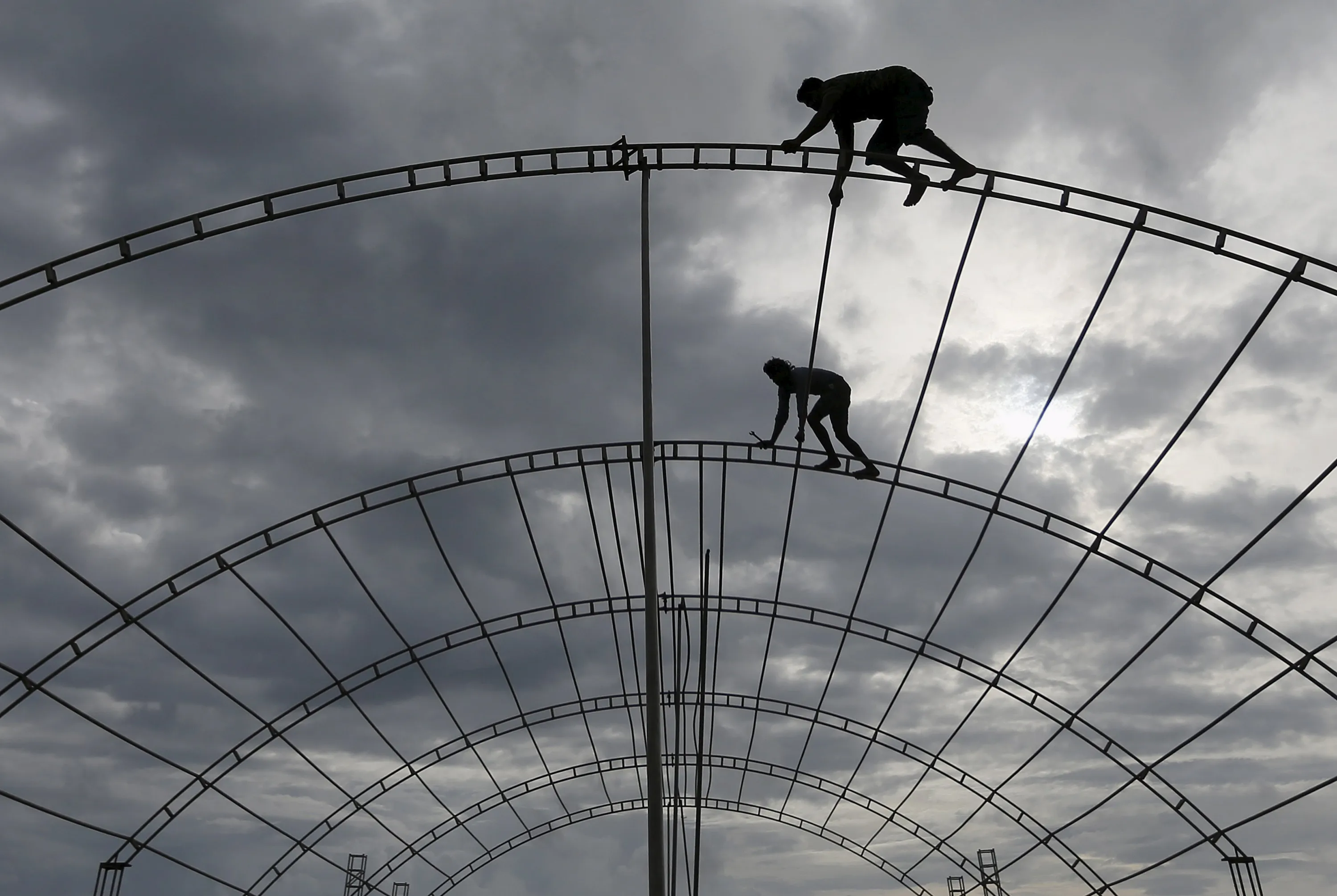 Laborers work on iron poles as while building a stage for a program in Colombo, Sri Lanka September 18, 2015. (Photo by Dinuka Liyanawatte/Reuters)